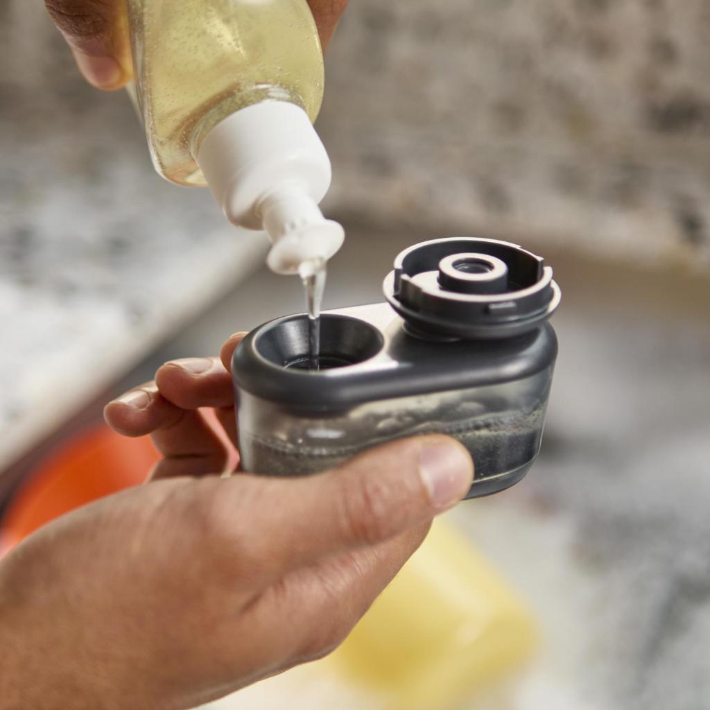 Ruokailun jäljiltä kuivunut lautanen on sitkeä vastus, mutta pesuainesäiliö suoraan kahvassa muuttaa pelin säännöt. Ei keskeytyksiä työssä, ei etsintää pullolle. Paina vain ja jatka, ikään kuin olisit juuri löytänyt astioidenpesun pikakelan.