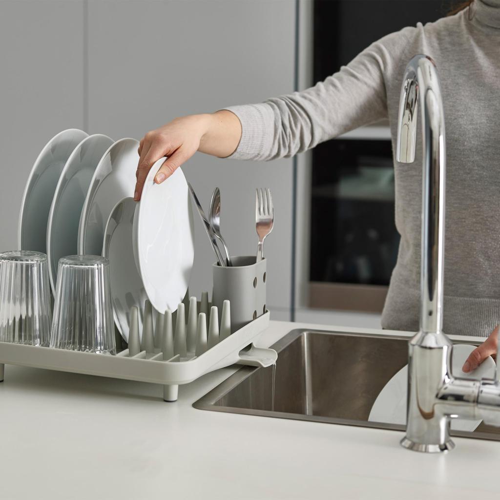 Minimalistinen muoto, yksinkertaiset linjat ja harkittu järjestely luovat tunteen, että jopa tavallisella astioiden kuivaamisella voi olla oma järjestyksensä. Lautaset nojaavat tappeihin, lasit seisovat tukevasti ja aterimet eivät liu'u pohjalla. Yhtäkkiä kyse ei ole vain märkien astioiden laskemisesta, vaan pienestä järjestelmästä, joka palauttaa tilan hallinnan jokaisen pesun jälkeen.