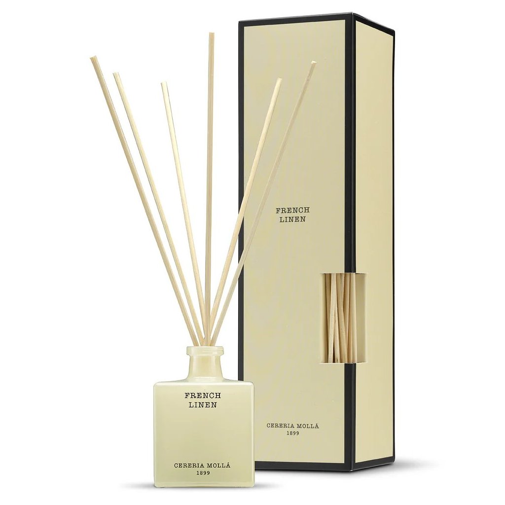 - aromidiffuusori, jossa on 12 luonnollista rottinkitikkua espanjalaisesta Cereria Mollá -perhetehtaasta