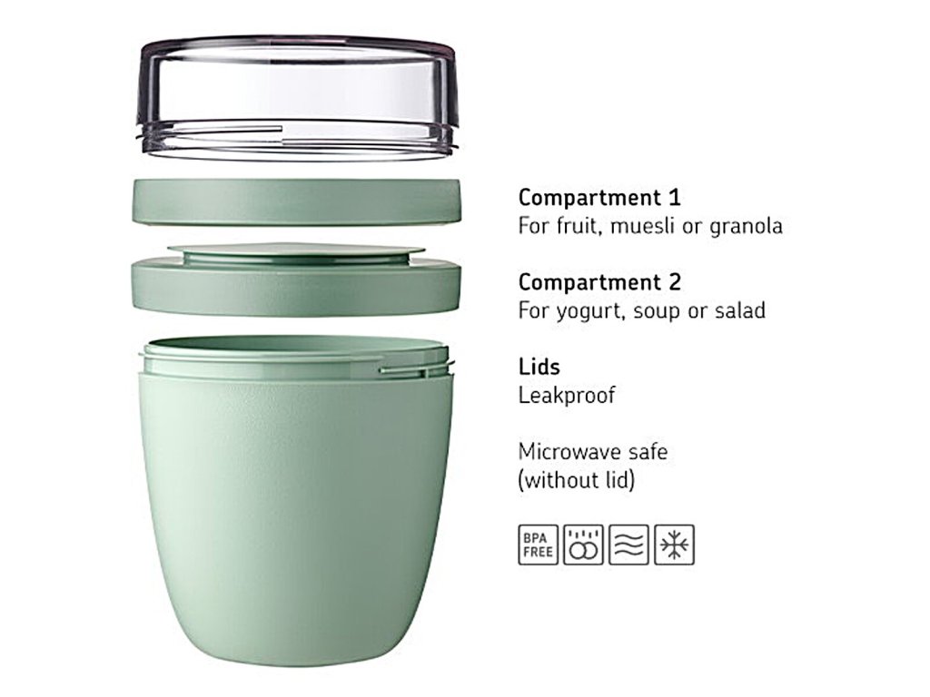 - Laatikko ELLIPSE on käytännöllinen säilytysrasia jogurtin ja myslin, keittojen tai dippikastikkeen kanssa tarjottavien vihannesten kuljettamiseen.