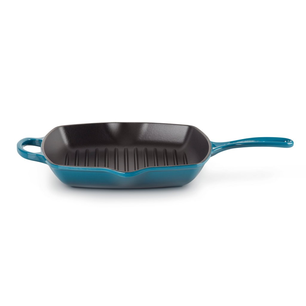- Neliönmuotoinen valurautapannu grillipannu Le Creuset, väri DEEP TEAL , sopii erinomaisesti lihan, kalan ja vihannesten nopeaan hauduttamiseen ja niiden maun ja mehukkuuden säilyttämiseen.