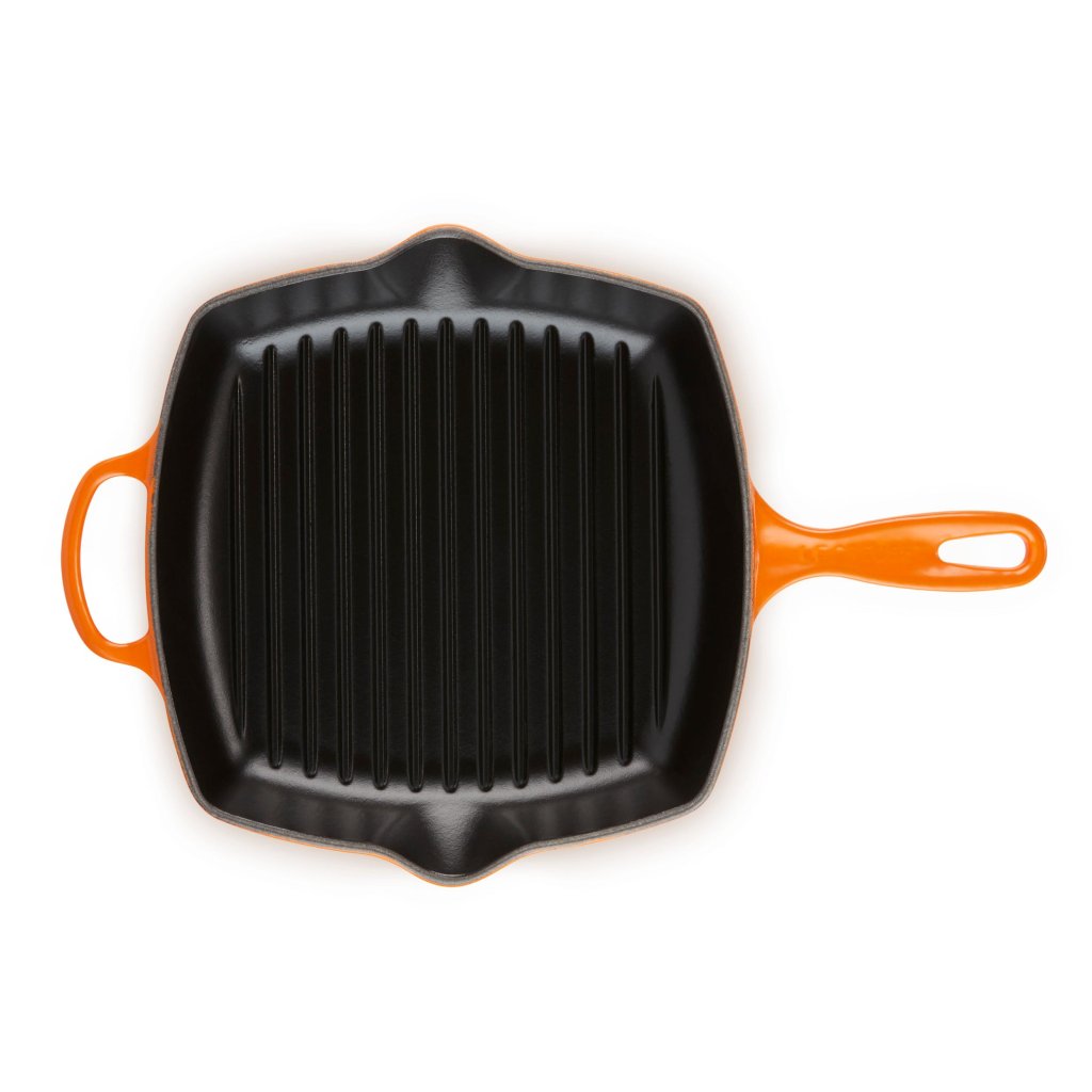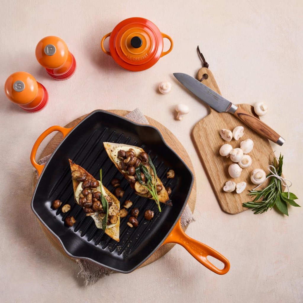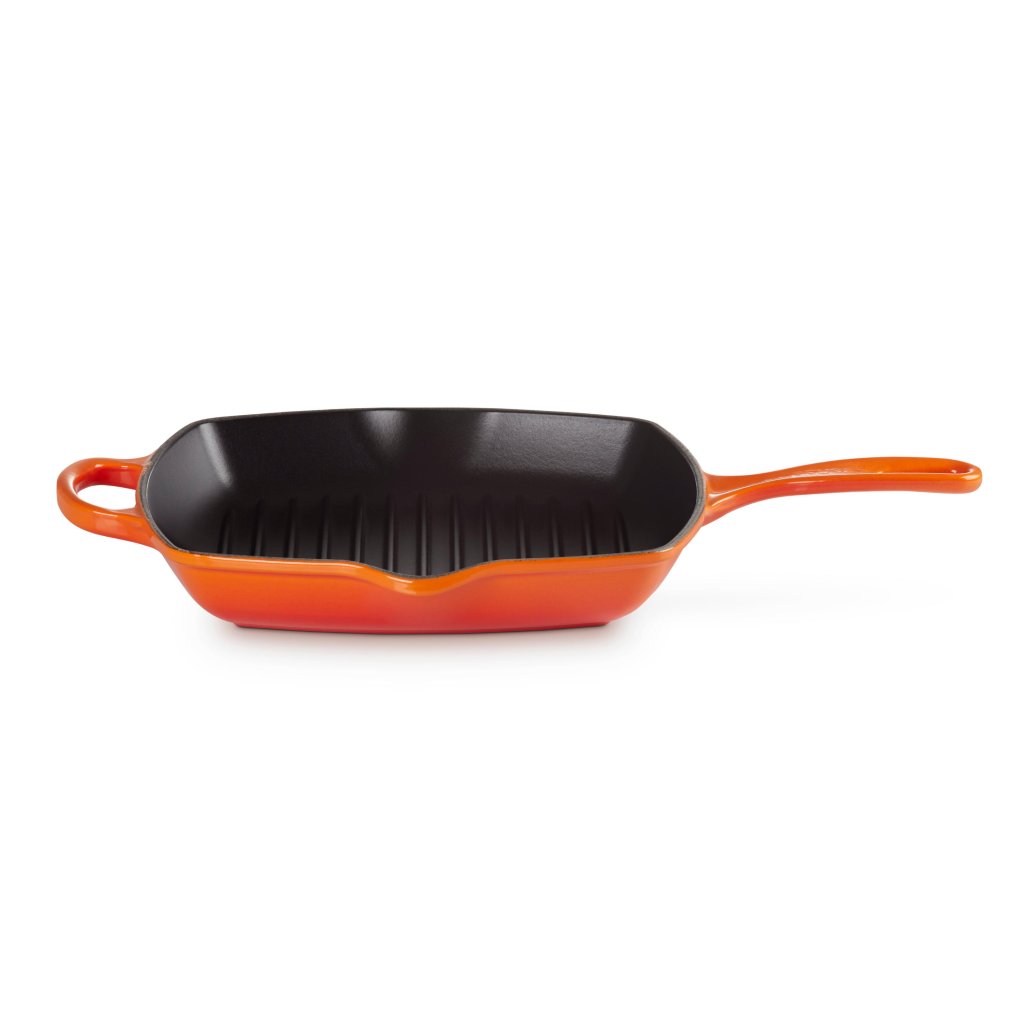 - Neliönmuotoinen valurautapannu grillipannu Le Creuset, jonka väri on FLAME , sopii erinomaisesti lihan, kalan ja vihannesten nopeaan hauduttamiseen ja niiden maun ja mehukkuuden säilyttämiseen.
