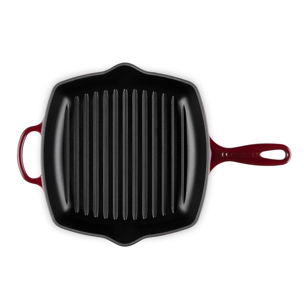 - Neliönmuotoinen valurautapannu grillipannu Le Creuset, jonka väri on GARNET , sopii erinomaisesti lihan, kalan ja vihannesten nopeaan hauduttamiseen ja niiden maun ja mehukkuuden säilyttämiseen.