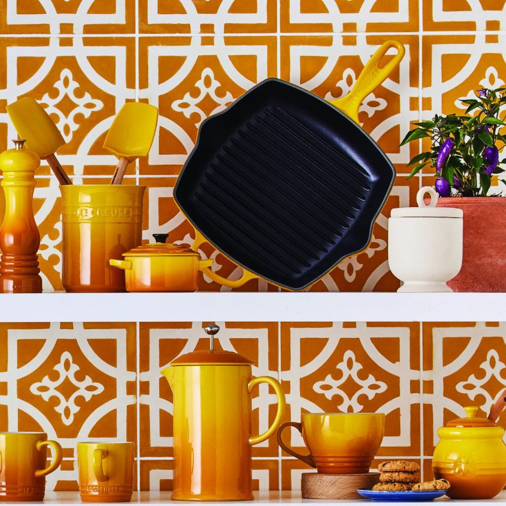 - Neliönmuotoinen valurautapannu grillipannu Le Creuset, väri NUIT , sopii erinomaisesti lihan, kalan ja vihannesten nopeaan hauduttamiseen ja niiden maun ja mehukkuuden säilyttämiseen.