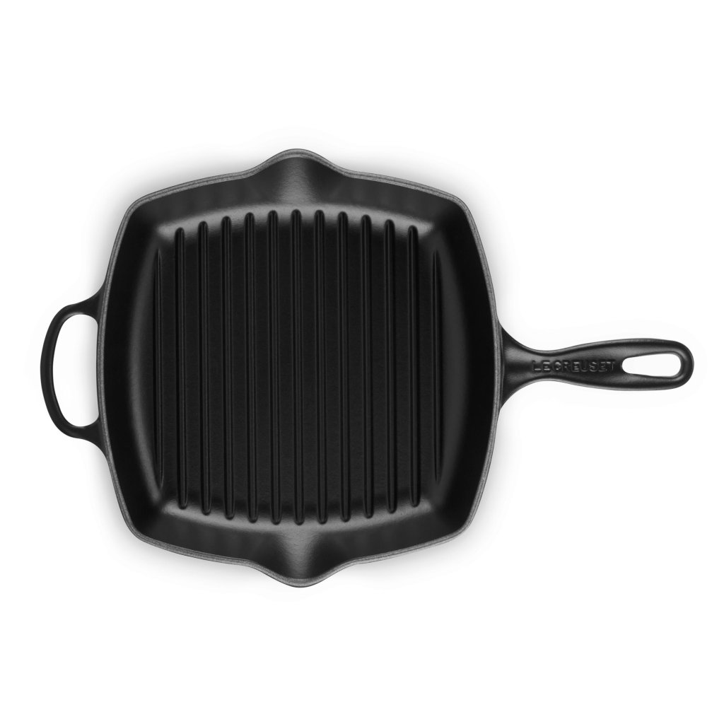 - Neliönmuotoinen valurautapannu grillipannu Le Creuset, väri SATIN BLACK , sopii erinomaisesti lihan, kalan ja vihannesten nopeaan hauduttamiseen ja niiden maun ja mehukkuuden säilyttämiseen.