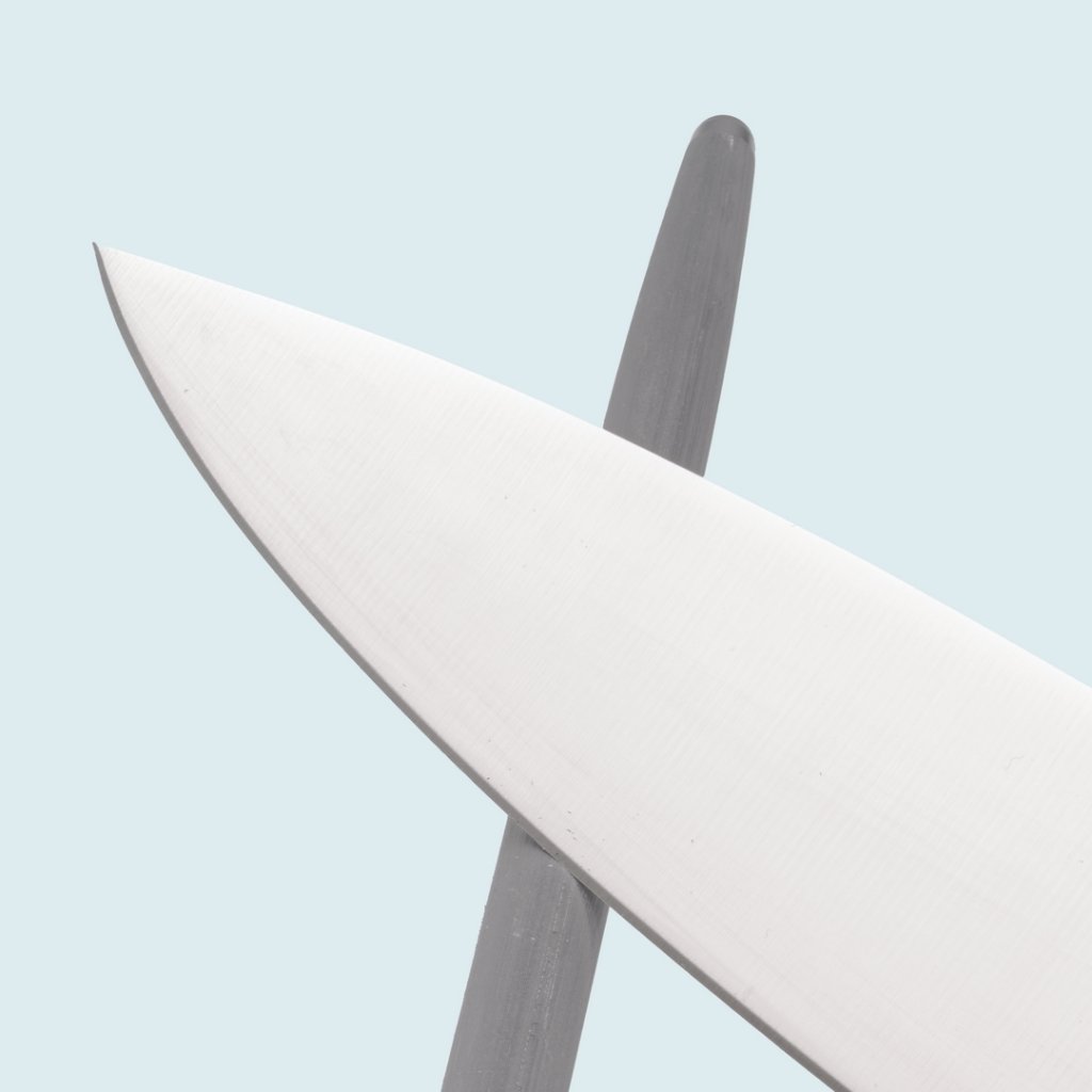 Pidä veitsen terää teroitin terävään kulmaan (noin 20°) nähden ja vedä sitä vuorotellen yhdeltä ja toiselta puolelta tasaisella voimalla teroitinta vasten. Pakkauksessa on yksinkertaiset ohjeet, miten se tehdään.