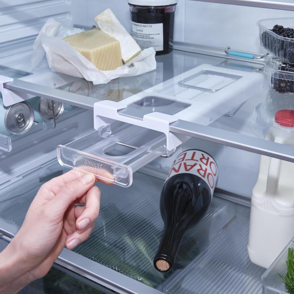 - Teline kiinnitetään helposti ja tukevasti suoraan jääkaapin hyllyn alle, joten se hyödyntää tähän asti hyödyntämätöntä tilaa ja auttaa pitämään jääkaapin sisätilan täydellisesti järjestyksessä.