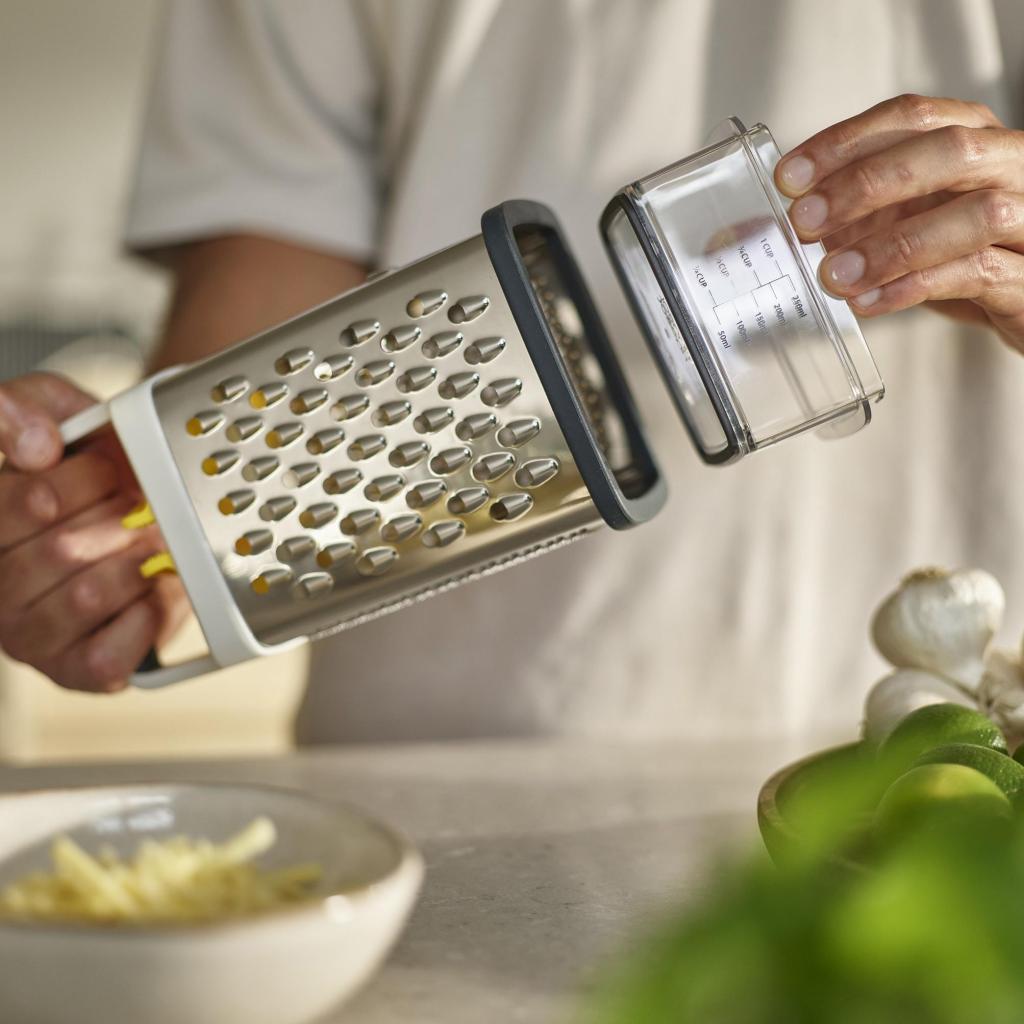 - Käytön jälkeen keräysastia voidaan säilyttää suoraan raastinraudan rungossa, mikä säästää tilaa varastoinnissa.