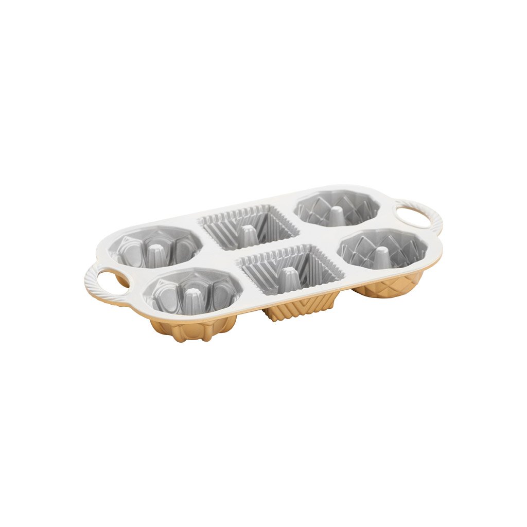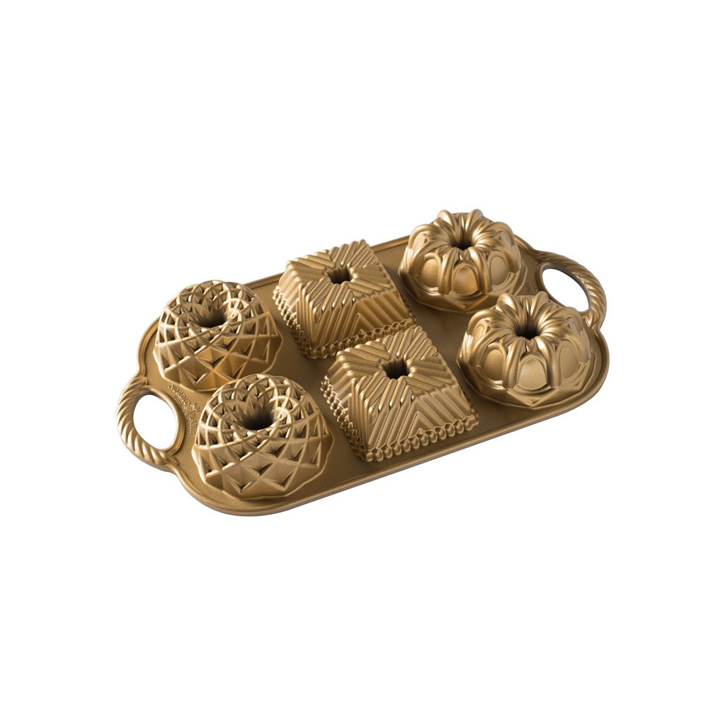 Nordic Ware -kakkuvuoka GEO BUNDLETTE BUNDT, 6 minikuivakakulle, eri muotoisia, kullanvärinen