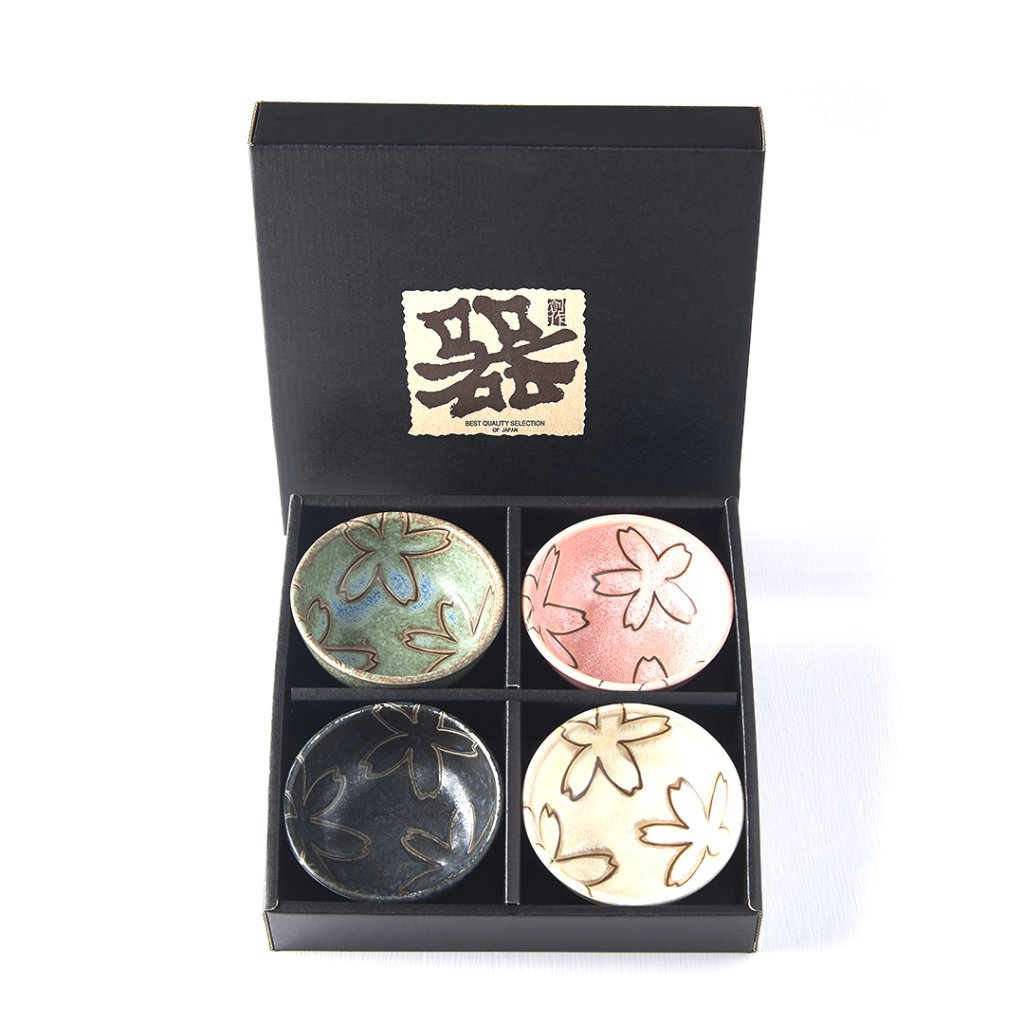 Setti sisältää 4 kulhoa, joiden värit ovat vihreä, vaaleanpunainen, sininen ja musta ja joissa on kukkakuvioita. Tämä setti toimitetaan tyylikkäässä mustassa lahjapakkauksessa, joten se sopii lahjaksi ystäville tai liikekumppaneille.