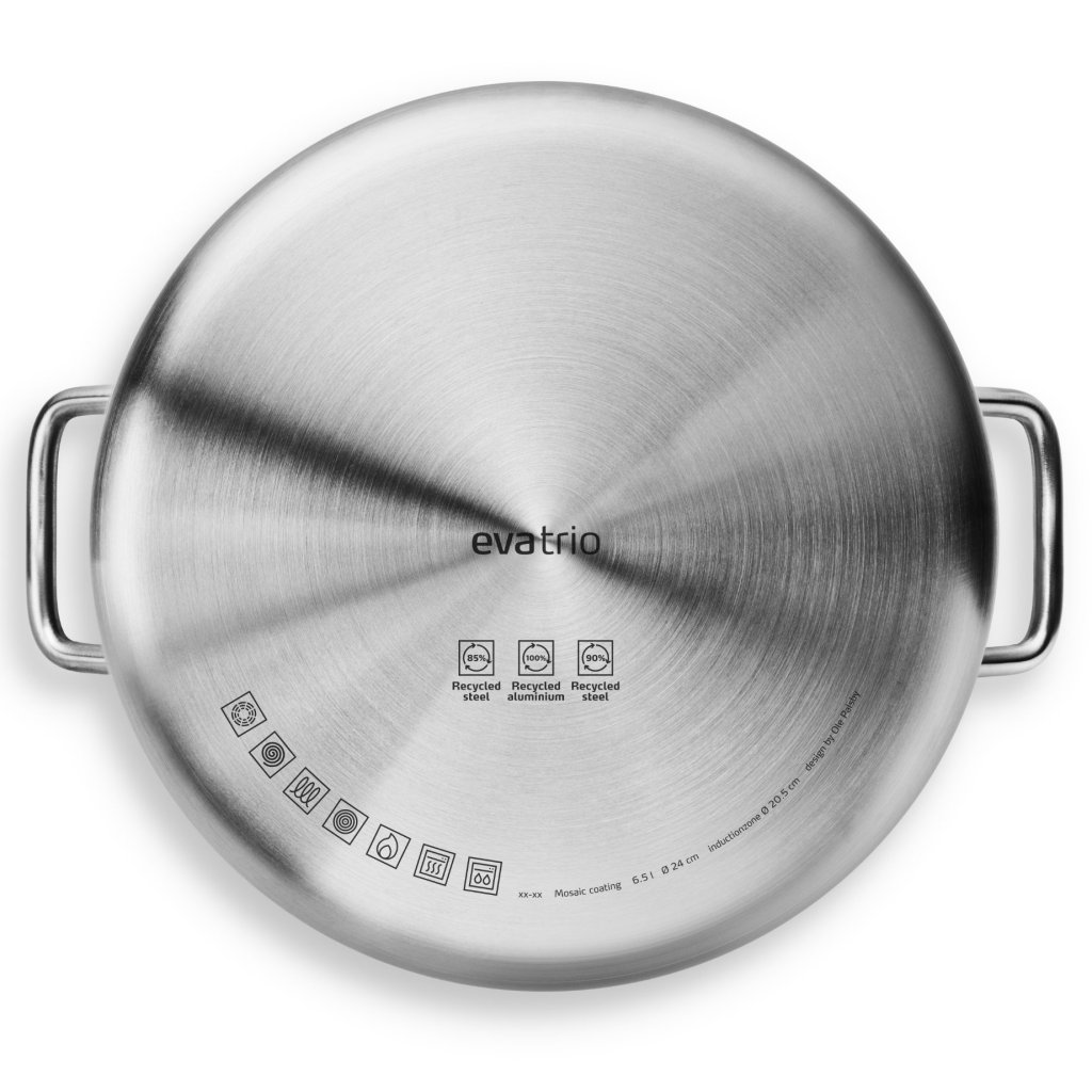 - Ruostumaton teräs kattila suurella 6,5 litran tilavuudella yhdistää perinteisen EVA-designin TRIO innovatiivisiin materiaaleihin, jotka parantavat ruoanlaittoa