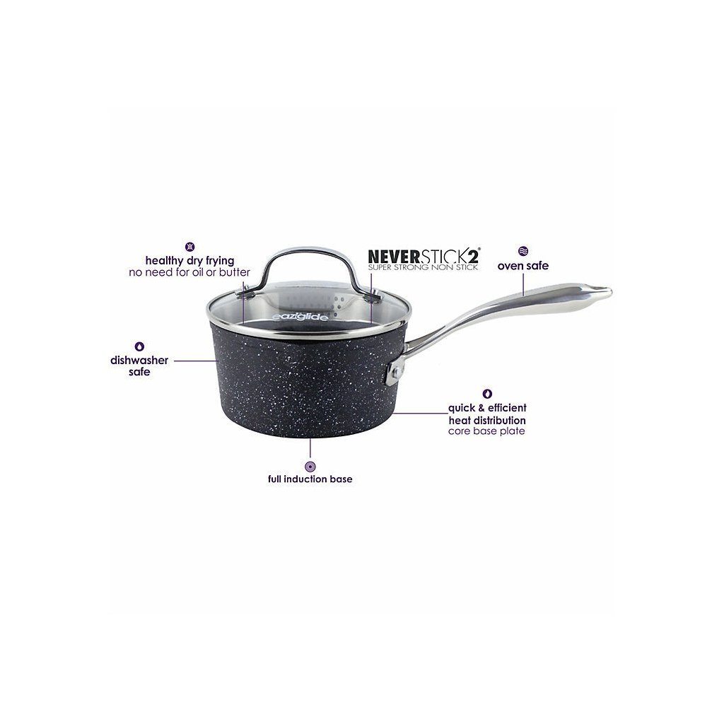 Neverstick2-keittoastiat Eaziglide edustavat viimeisintä teknologiaa ja vallankumouksellisia innovaatioita tarttumattomien keittoastioiden alalla. Eaziglide Karkaistusta alumiinista valmistettu Neverstick2 on suunniteltu erityisesti helpottamaan elämääsi. Yksinomainen Neverstick2-pinta kestää paljon kauemmin kuin muut pinnat ja käyttää 7 kertaa vahvempaa teknologiaa, joten voit valmistaa ruokaa terveellisesti ilman öljyä tai muita rasvoja.