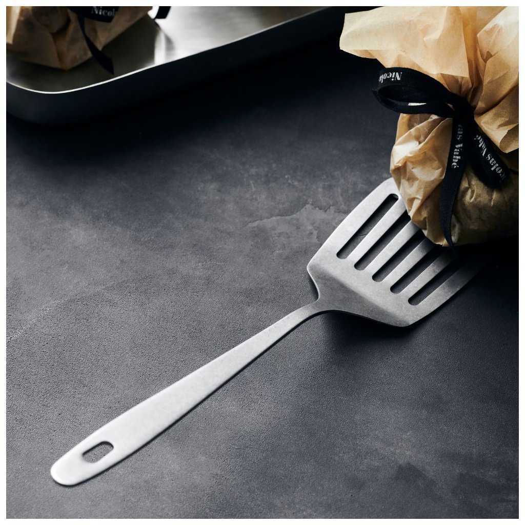 - liukuu helposti pannulla olevan lihan, munien ja kalan alle ja valuttaa rasvan pois