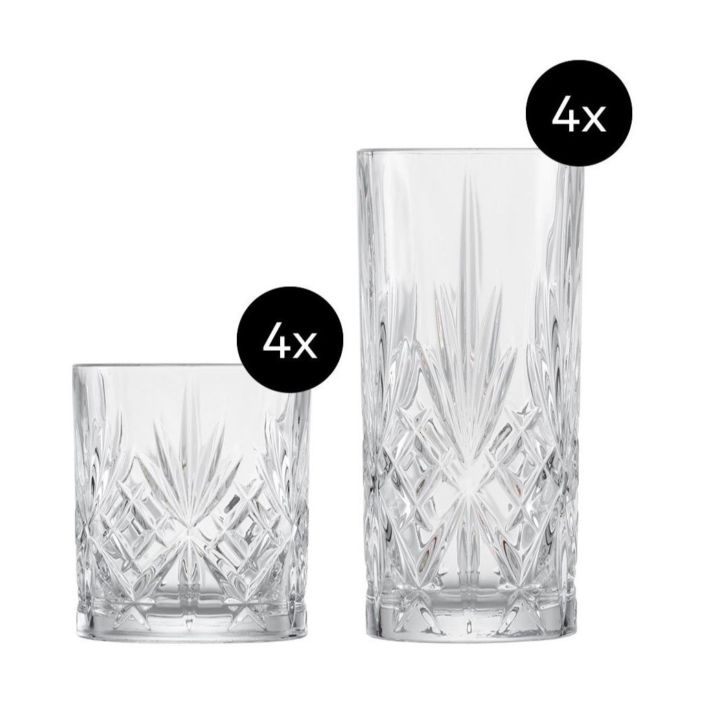 - SHOW-lasisetti tuotemerkiltä Zwiesel Glas sisältää neljä viskilasi -lasia ja neljä lonkeroille tarkoitettua lasia monipuoliseen käyttöön.