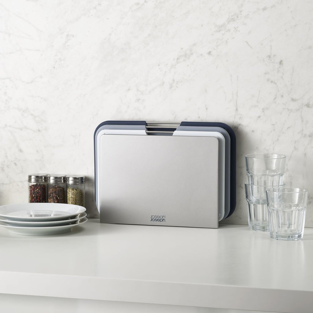 Muovisten leikkuulautojen vahvuus on ehdottomasti niiden helppo huollettavuus, hygienia ja ennen kaikkea se, että ne ovat herkkiä veitsillemme. Joseph Joseph suunnittelijoiden tavoitteena oli tällä kertaa tarjota leikkuulauta käteen työtasolle, valmistaa ainutlaatuisia leikkuulautoja, jotka täyttävät tarkoituksen 100-prosenttisesti, ja myös ratkaista niiden tyylikäs säilytys. Nest-leikkuulautateline on setti yleisimpiin keittiötöihin.
