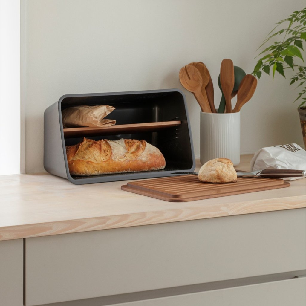 - Hiilihapotetusta, FSC-sertifioidusta bambusta valmistettu kansi toimii myös leikkuulauta -leivänsuojana