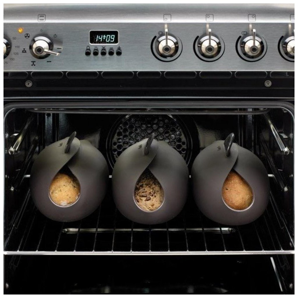 - kulhon muoto on osittain suljettu, jolloin höyry pääsee kiertämään kulhon sisällä, mikä tekee taikinasta kosteaa, estää leipää kuivumasta ja antaa sille rapean, kultaisen rakenteen