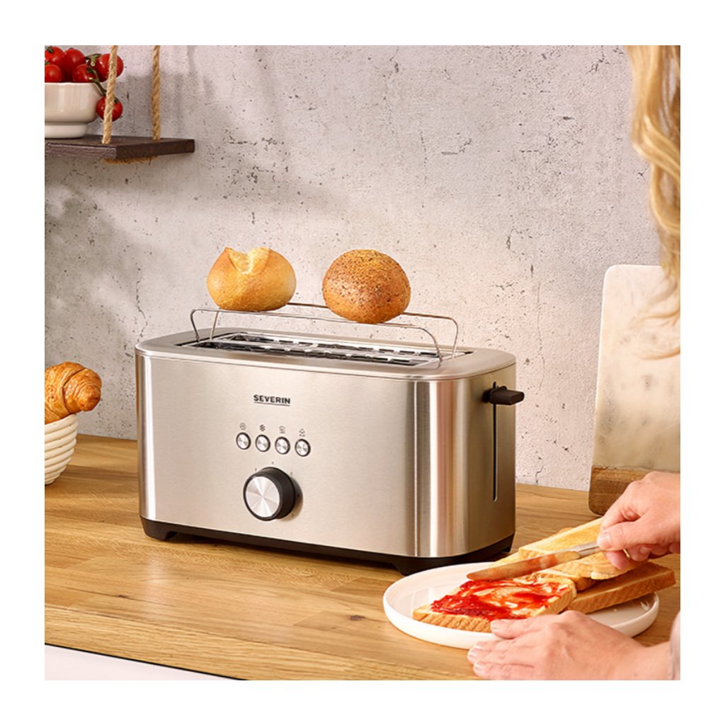 - kaksi suurta paahtopaikkaa, joissa on integroitu paahdinlisälaite, ihanteellinen 4 XXL-paahtoleivälle, viipaloidulle leivälle, sämpylöille ja bageleille