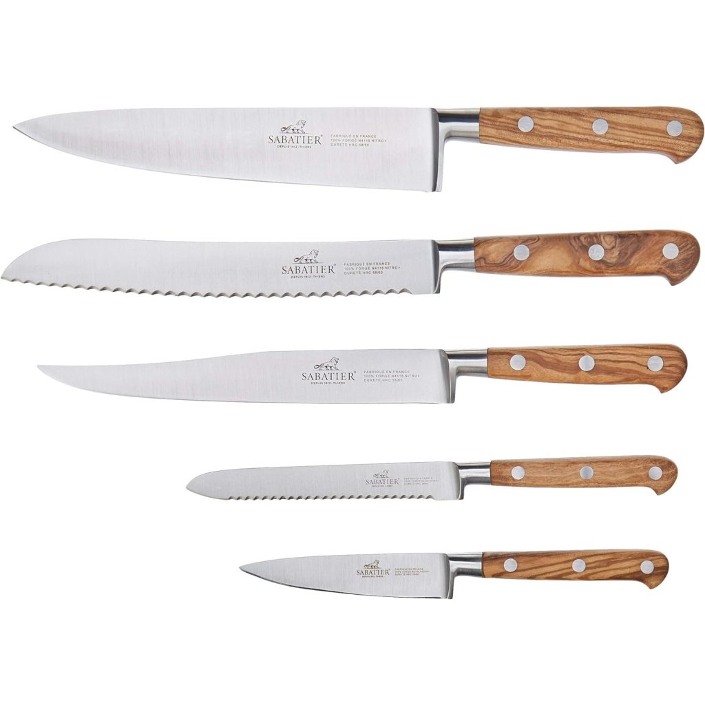 - 5 veitsen sarja oliivipuusta muotoillussa lohkossa