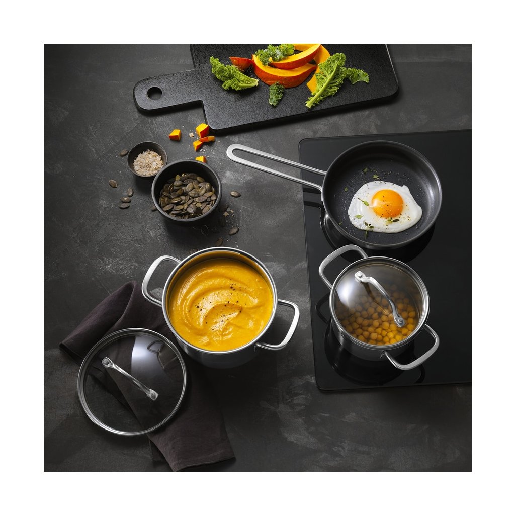 Halkaisijaltaan 14 cm:n ja tilavuudeltaan 1,5 litran kattila on valmistettu ruostumattomasta teräksestä, jossa on alumiinisydän. Naarmuuntumaton satiinisileä pinta näyttää ylelliseltä ja ajattomalta. Se soveltuu kaikentyyppisille liesille, mukaan lukien induktioliesi, uuni 200 °C:seen asti ja astianpesukone.