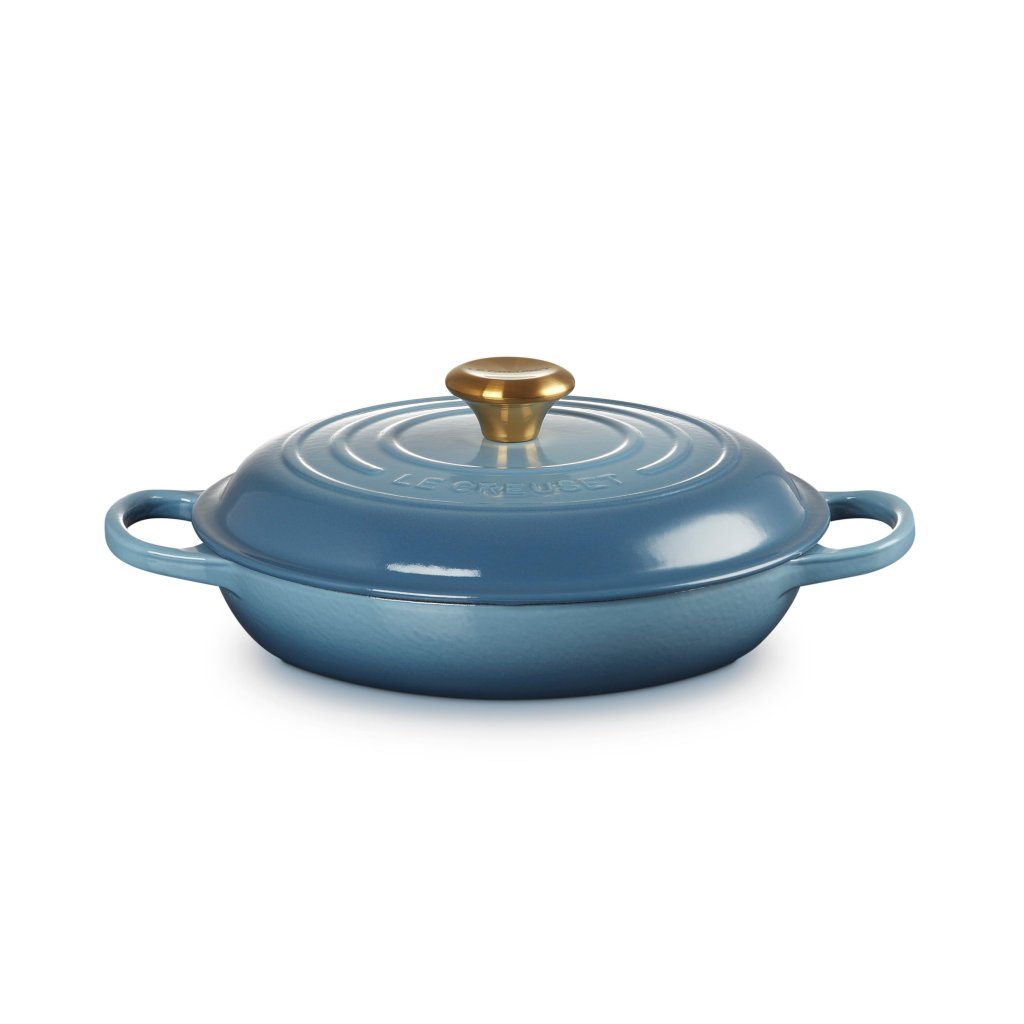 - Ranskassa valmistettu, matala pata Le Creuset -valurautapannu, jonka väri on CHAMBRAY , on yksi merkin legendaarisista tuotteista. Se sopii erinomaisesti hauduttamiseen, paistamiseen, leivontaan ja grillaamiseen 2–4 hengelle.