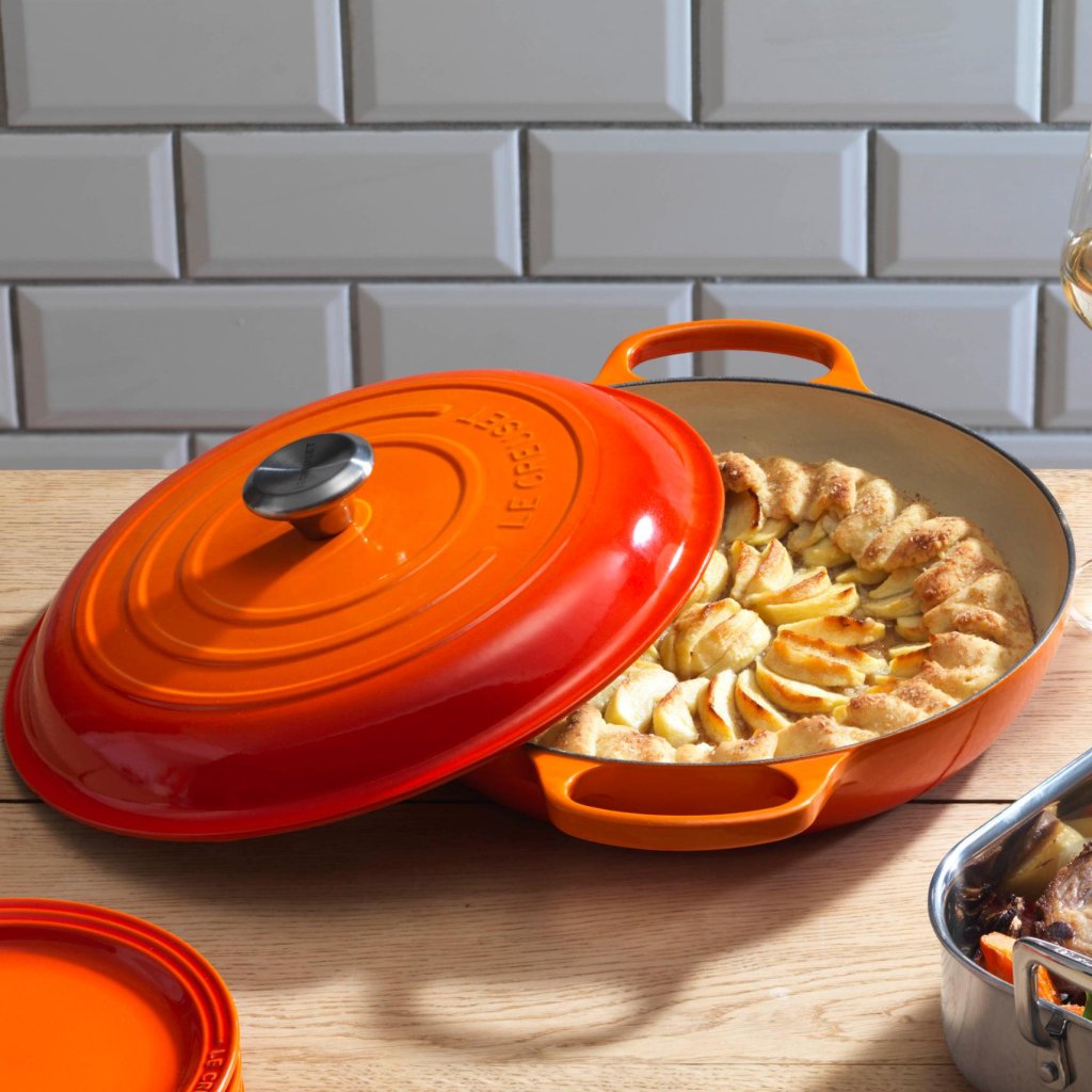 - Ranskassa valmistettu, matala pata Le Creuset -valurautapannu, jonka väri on FLAME , on yksi merkin legendaarisista tuotteista. Se sopii erinomaisesti hauduttamiseen, paistamiseen, leivontaan ja grillaamiseen 2–4 hengelle.