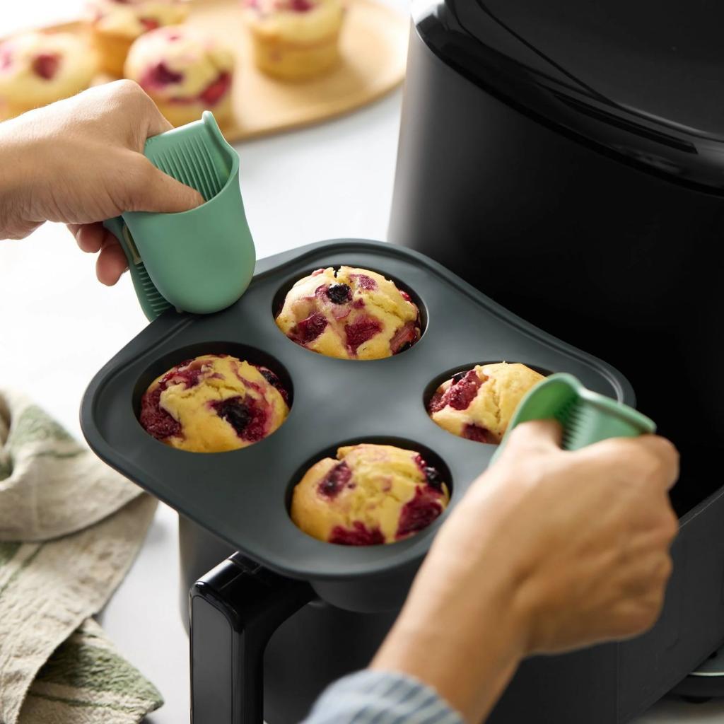 On aina kätevää, kun on valmiina jotakin, jonka avulla satunnainen makeanhimo voidaan muuttaa suunnitelmaksi, joka ei vie koko iltapäivää. Neljän reiän muffinivuoka -ilmafriteerauskeitin on juuri sellainen kompromissi kotileivonnan ja maalaisjärjen välillä. Täytä, aseta ja vedä, ja voit teeskennellä, että olet tajunnut kaiken aamusta asti.