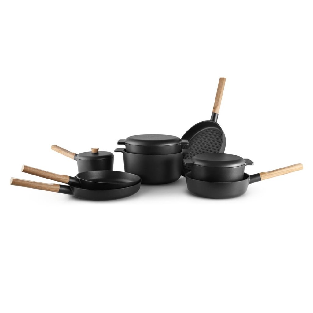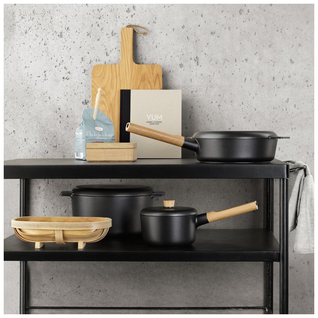Pidätkö valurautaisista keittoastioista, mutta häiritseekö niiden ylimääräinen paino sinua? Silloin tanskalaisen tuotemerkin Nordic kitchen -sarja on sinua varten Eva Solo. Luonnonraudasta valmistetut pannut - mutta kevyestä ja kestävästä alumiinista, jossa on tarttumaton Slip-Let®-sisäpinnoite. Sarja on suunniteltu erittäin yksinkertaisella ja maalaismaisella muotoilulla. Musta alumiinipinnoite muodostaa kontrastin tammikahvojen kanssa, mutta kokonaisuus näyttää tyylikkäältä ja tasapainoiselta. Ripaus lämmintä puuta, joka sopii kaikkiin keittiöihin.