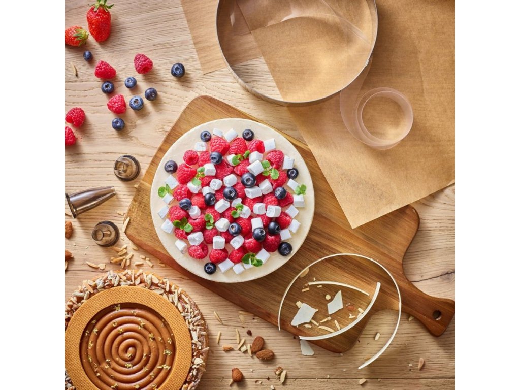 - pyöreä, 4,5 cm korkea leivontareunus ruostumattomasta teräksestä on suunniteltu kakkujen, jälkiruokien tai kylmämuotoilun kokoamiseen
