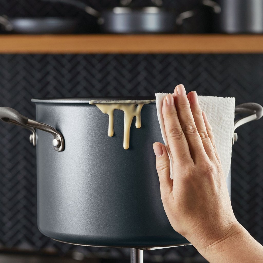- erityinen ScratchDefense-teknologia, joka käyttää ilmailu- ja avaruusluokan kestävyyttä, eliminoi naarmujen, kuoriutumisen ja ruoan tarttumisen riskin