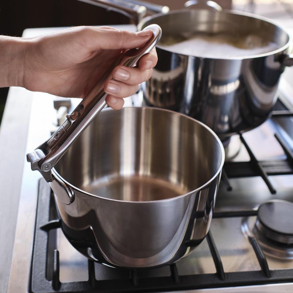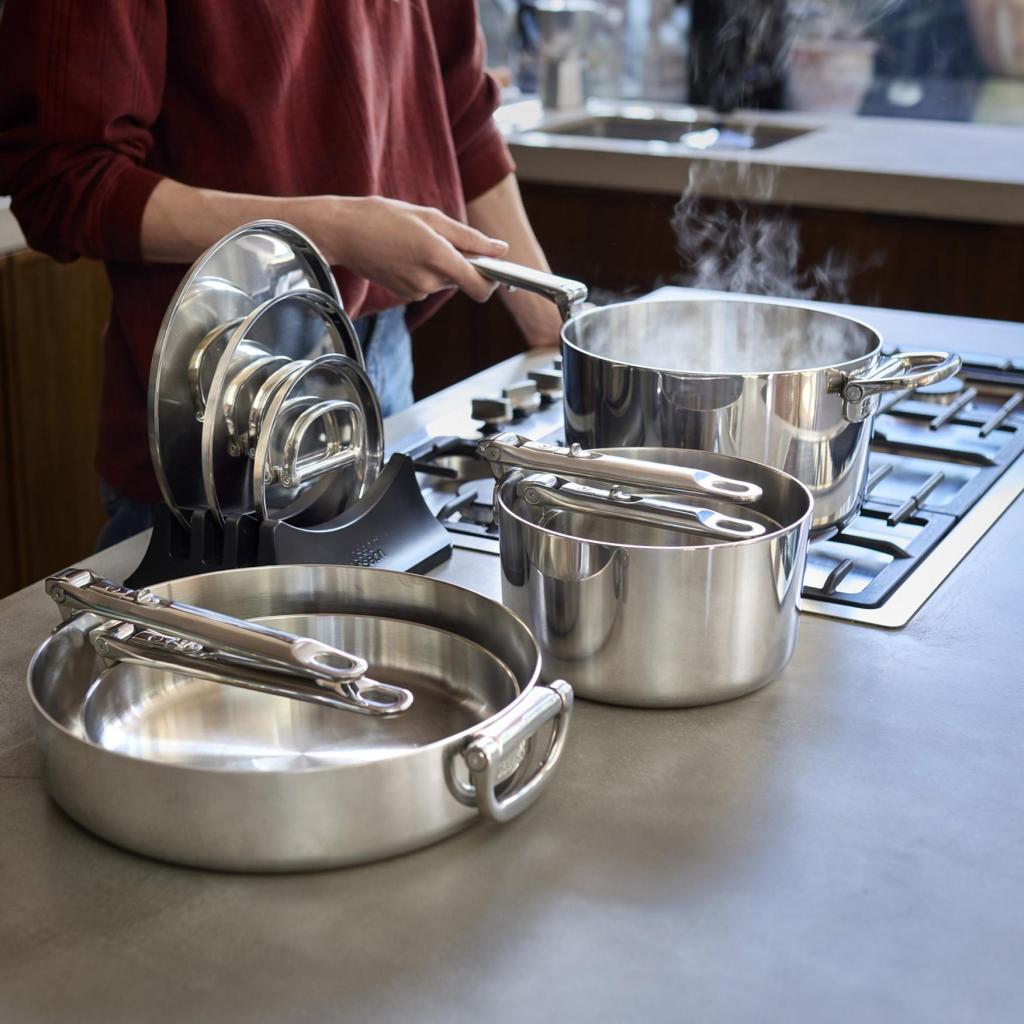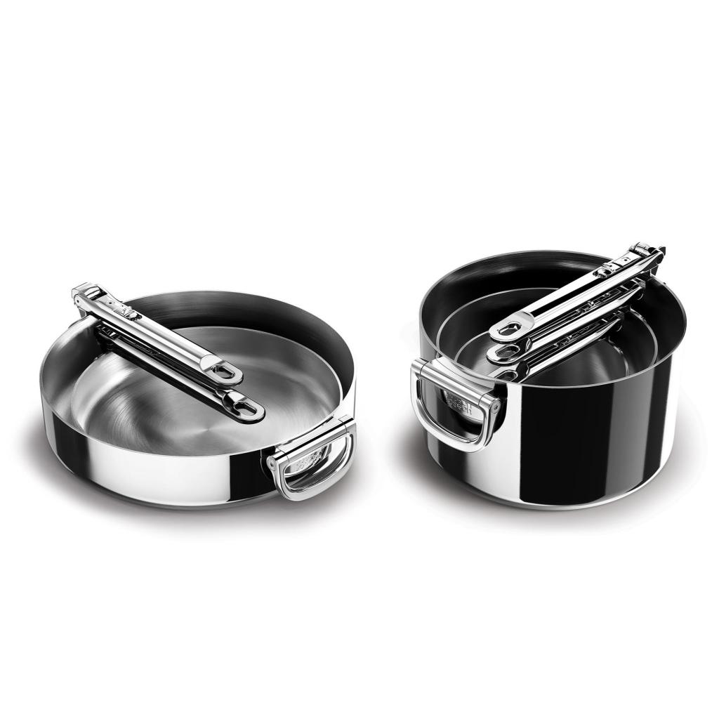 - Ruostumattomasta teräksestä valmistetut kattilan kansi -astiat on varustettu taitettavilla ruostumattomasta teräksestä valmistetuilla kahvoilla taloudellista säilytystä varten, ja niiden muotoilu mahdollistaa kompaktin säilytyksen telineessä.