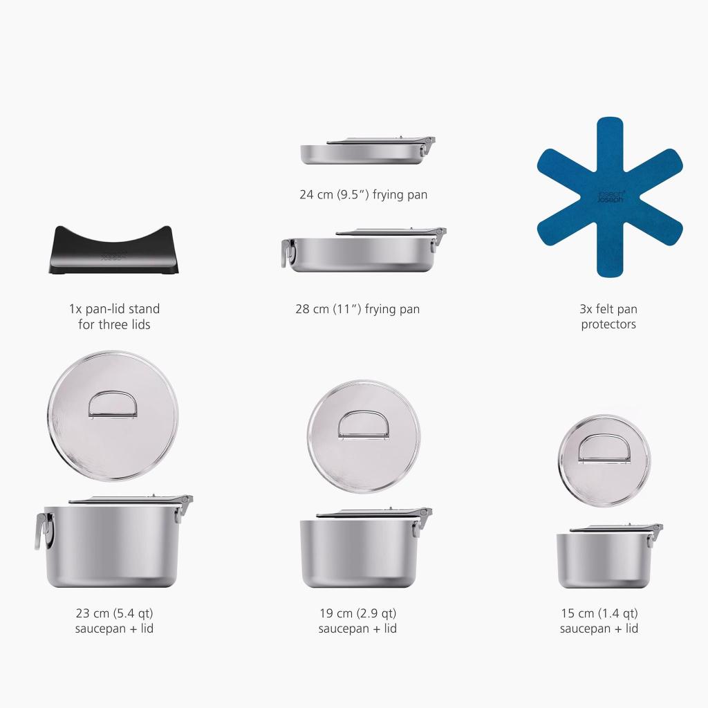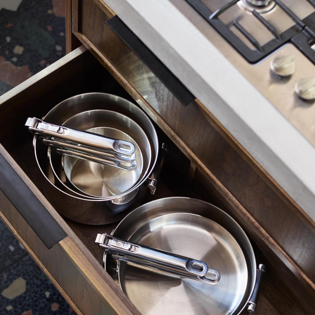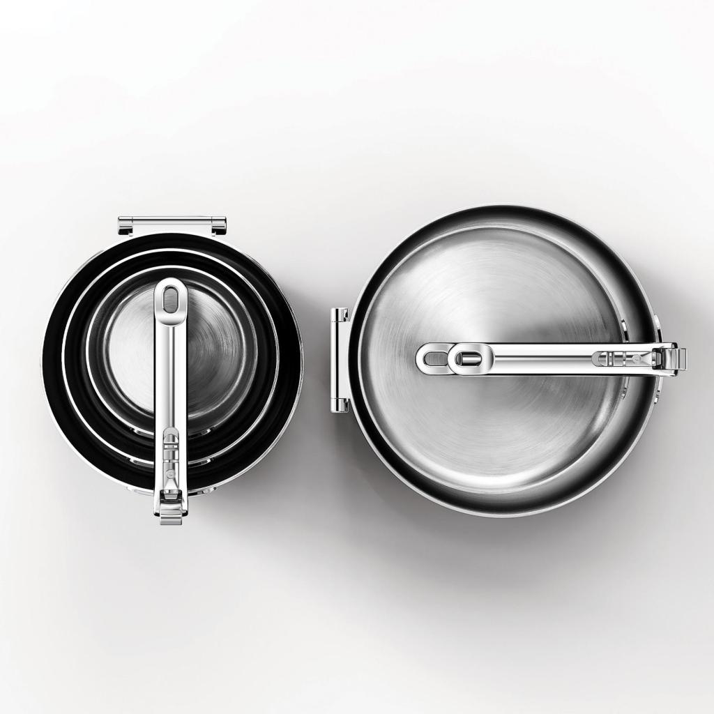 - Kompakti pinottava muotoilu mahdollistaa yksittäisten kattiloiden ja pannujen asettamisen sisäkkäin, kun taas kokoontaitettavat kahvat vähentävät merkittävästi tilantarvetta jopa 50 %.