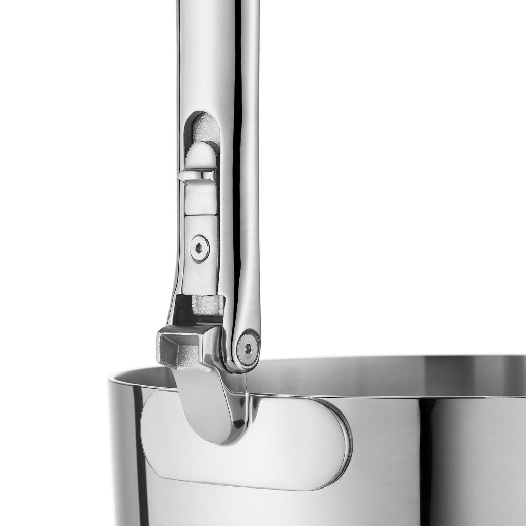 - Suuret sivuttaiset ruostumattomasta teräksestä valmistetut kahvat suuremmissa astioissa ovat myös kokoontaitettavia, mikä tukee turvallista käsittelyä molemmin käsin myös täydellä kuormalla.