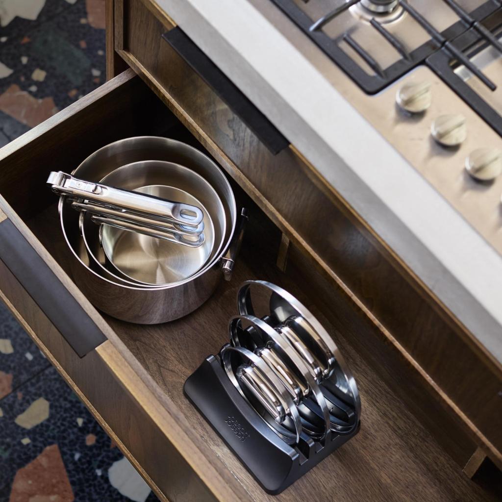 - Kätevät kattilan kansien telineet vetävät jopa kolme kantta ja auttavat pitämään keittiön kaapin järjestyksessä.