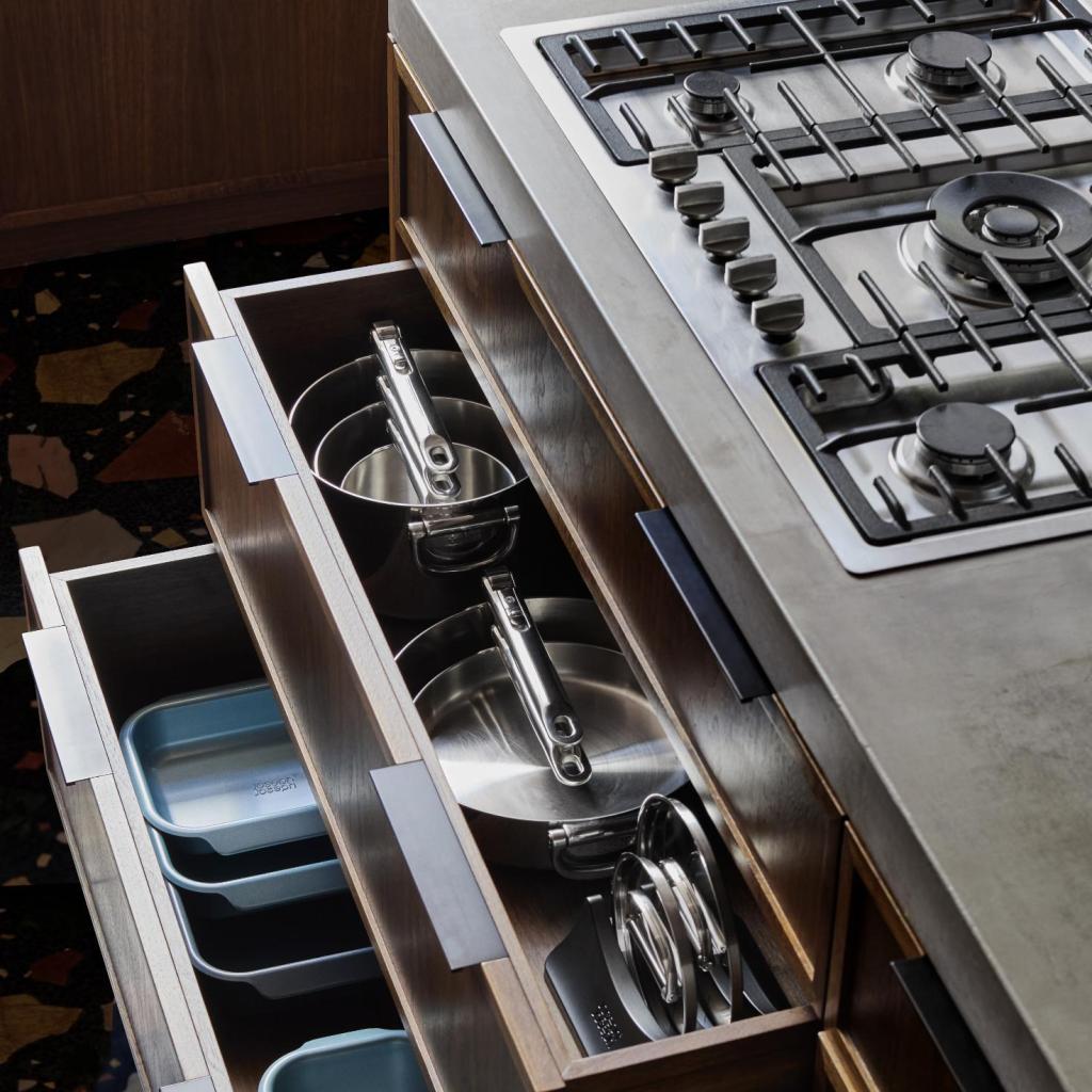 - Ensiluokkainen keittoastiasto Joseph Joseph SPACE mullistaa keittiön organisoinnin hienostuneen pinoamisjärjestelmän ja ammattimaisen kolmikerroksisen rakenteen ansiosta.