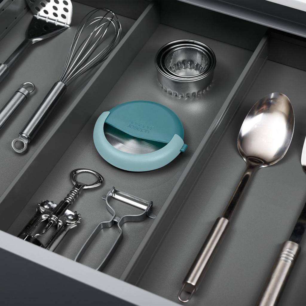 - Kompaktin rakenteensa ansiosta sitä on helppo säilyttää muiden keittiövälineet -luokan työkalujen joukossa ilman, että terävät reunat vahingoittavat muita työkaluja.