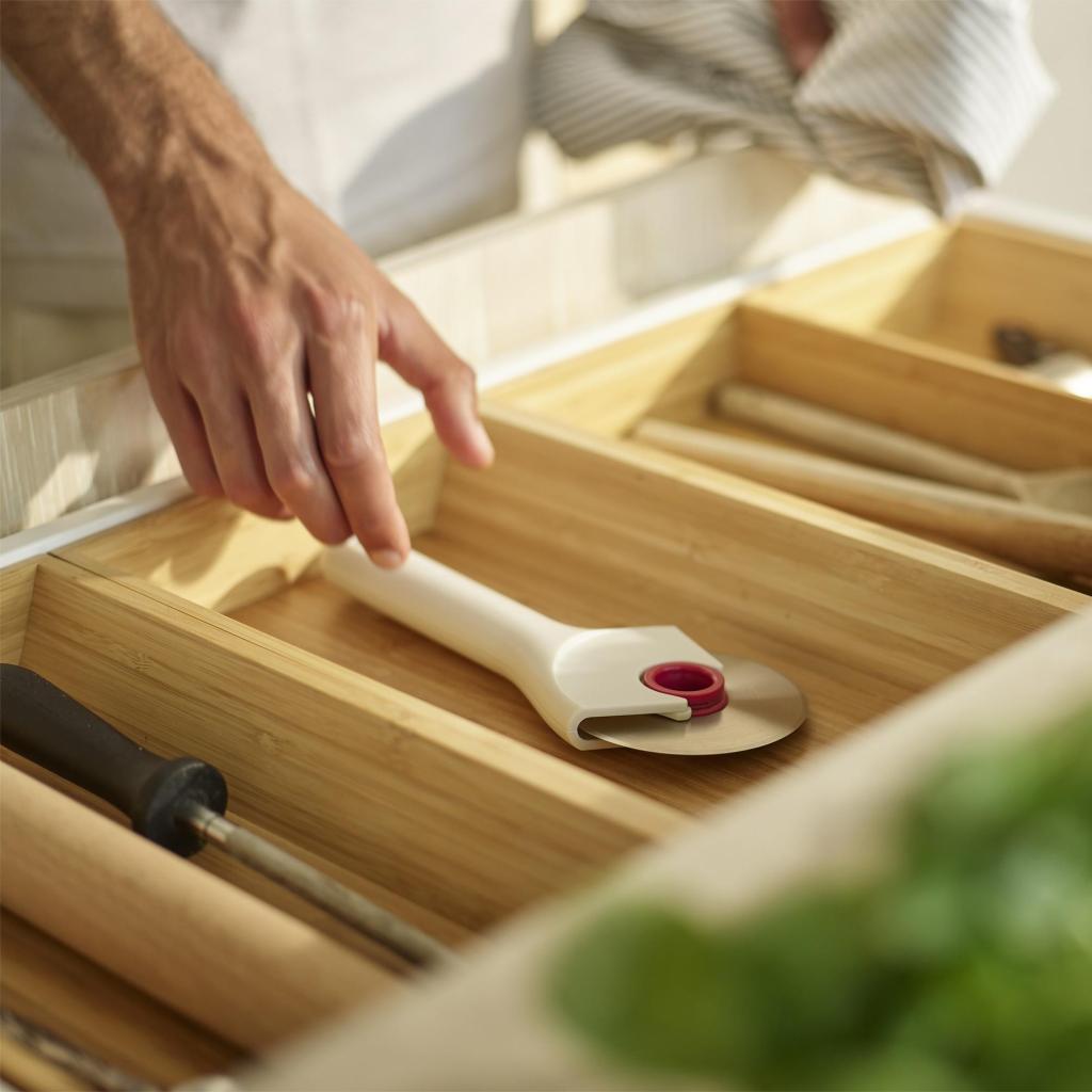 - Kompakti muotoilu sopii hyvin keittiön laatikkoon tai muihin keittiövälineet-hyllyihin.