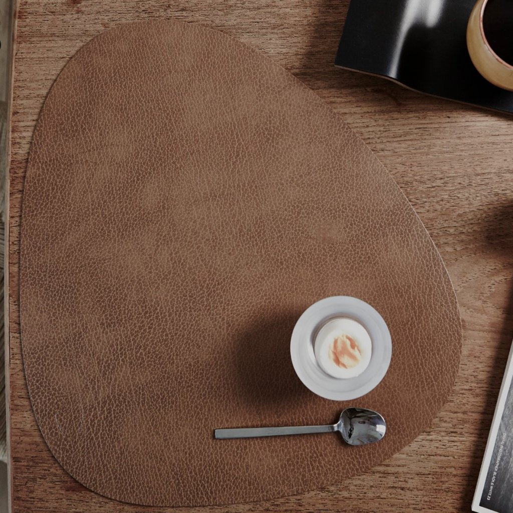 - kaksipuolinen pöytätabletti kierrätetystä nahka luonnonkumisekoituksella - ylellinen, ekologinen valinta, joka tuo luonnollista eleganssia pöytään