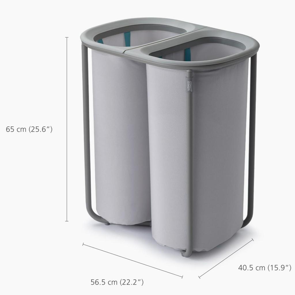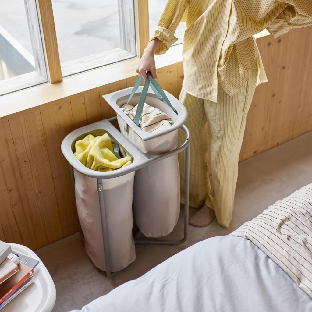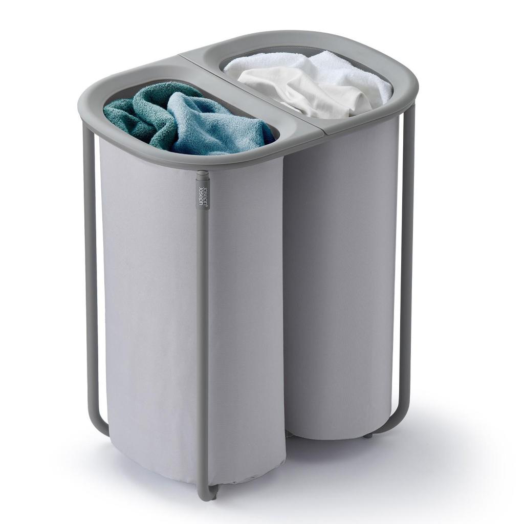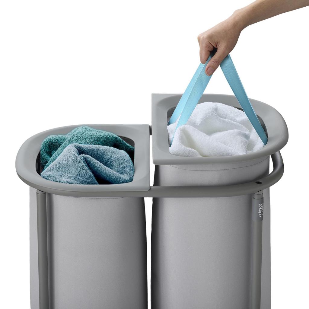 - Pyykkikori Joseph Joseph DUO, jonka kokonaistilavuus on 80 litraa, on suunniteltu pyykin kätevään ja selkeään lajitteluun säilytyksen aikana.