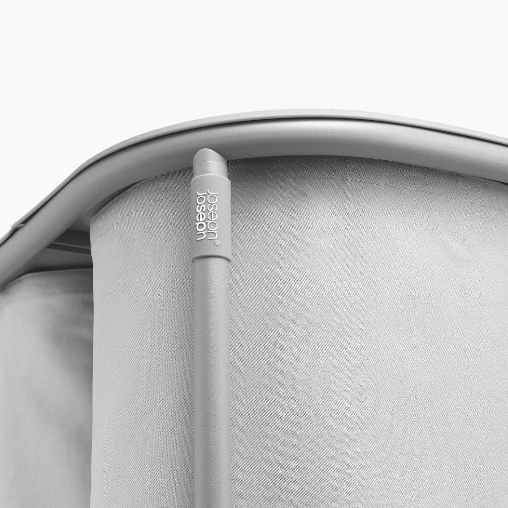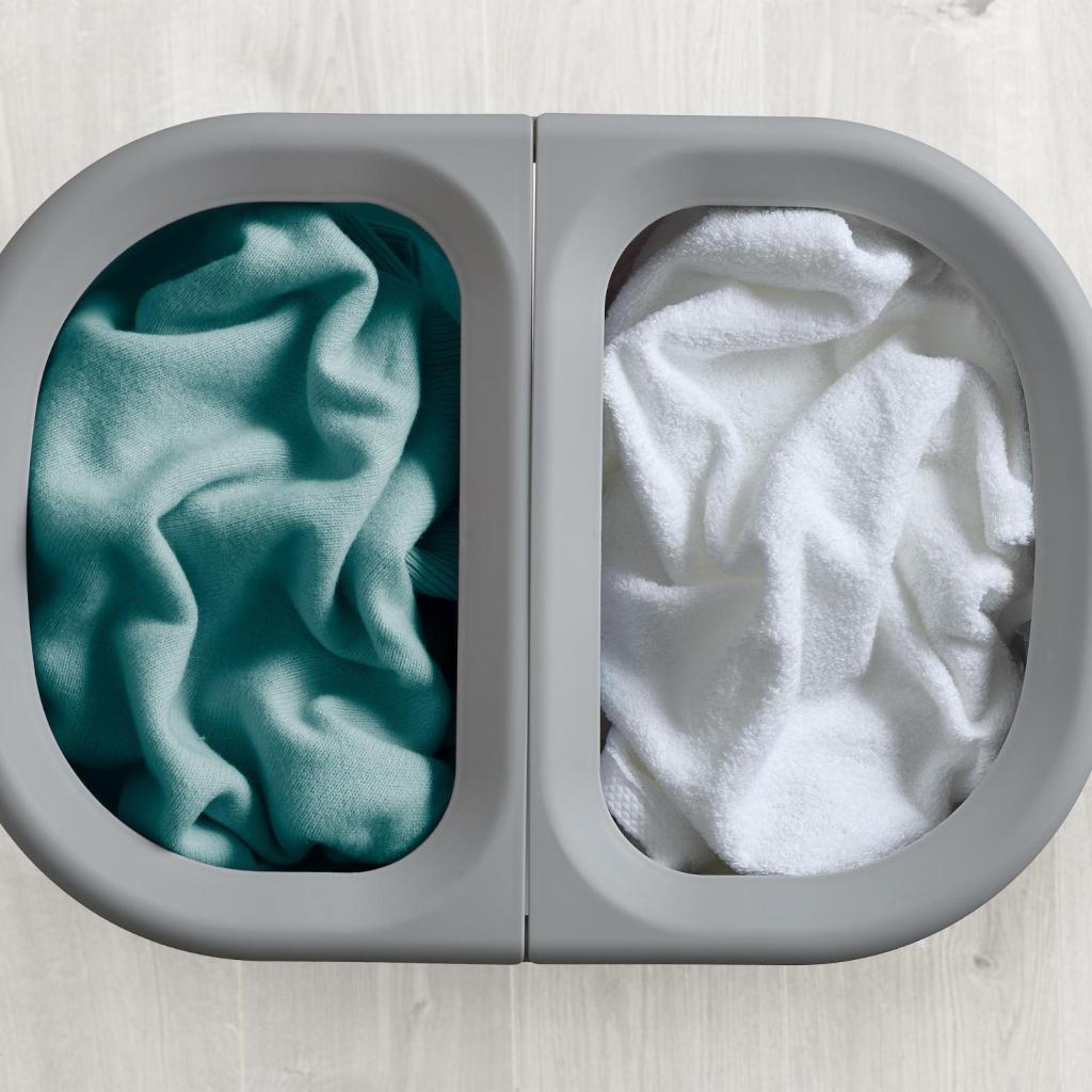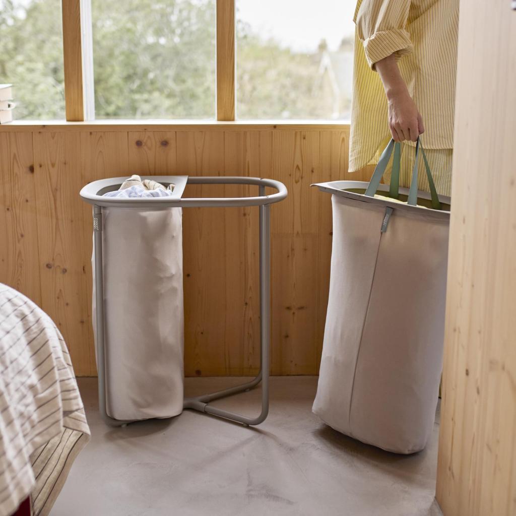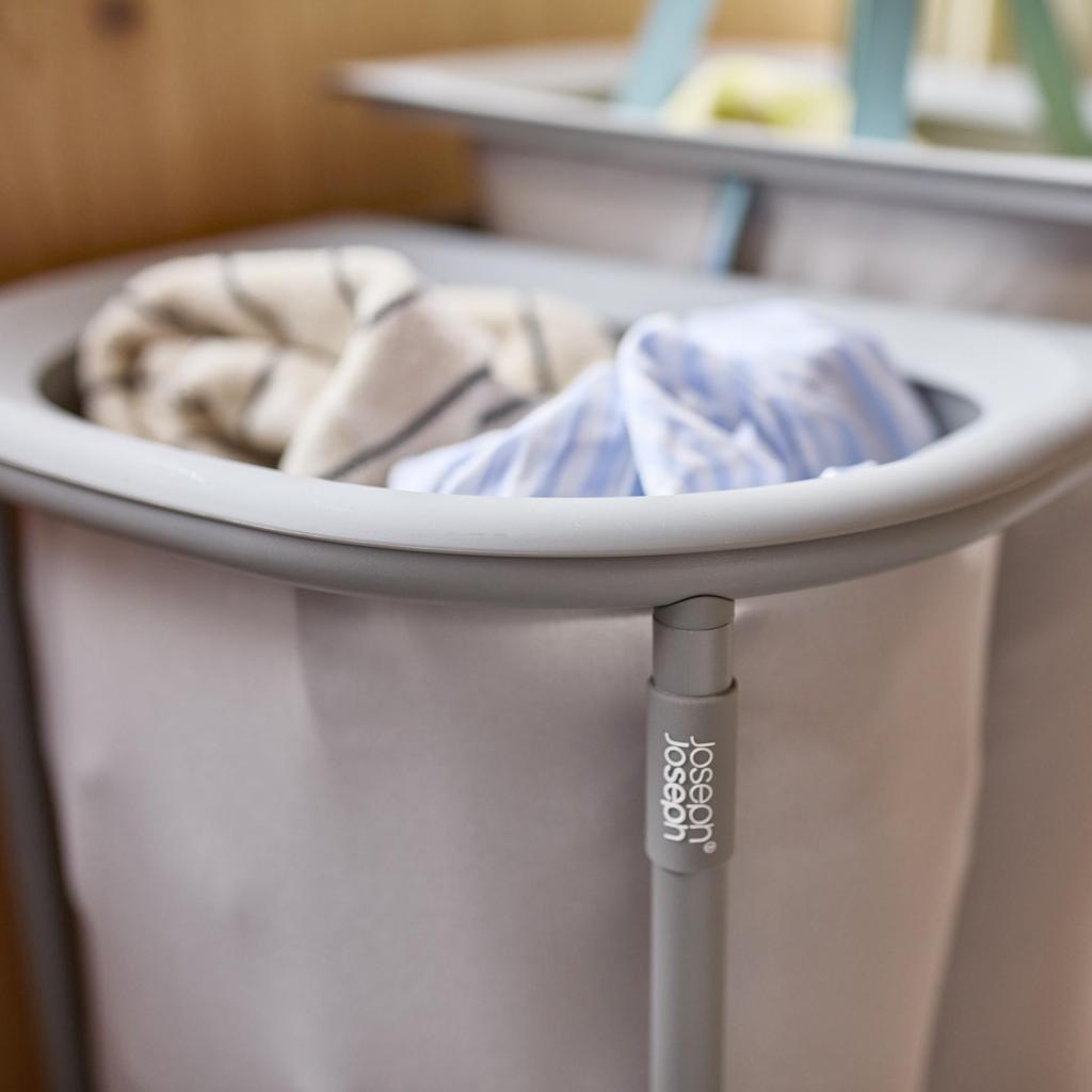 - Pyykkikori Joseph Joseph DUO, jonka kokonaistilavuus on 80 litraa, on suunniteltu pyykin kätevään ja selkeään lajitteluun säilytyksen aikana.