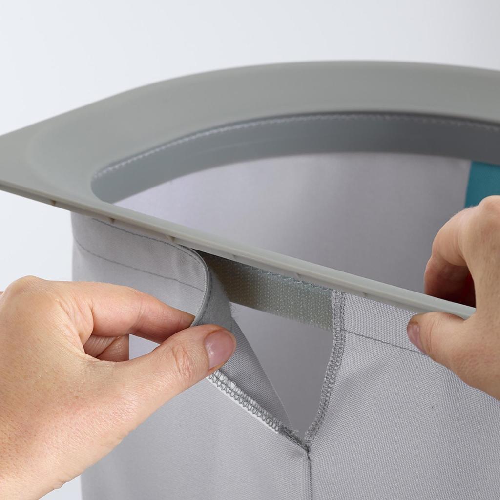 - Korin yläosa on jaettu kahteen aukkoon, joissa on tukevat muovireunat, jotka pitävät pussit auki ja helpottavat pyykin lisäämistä.