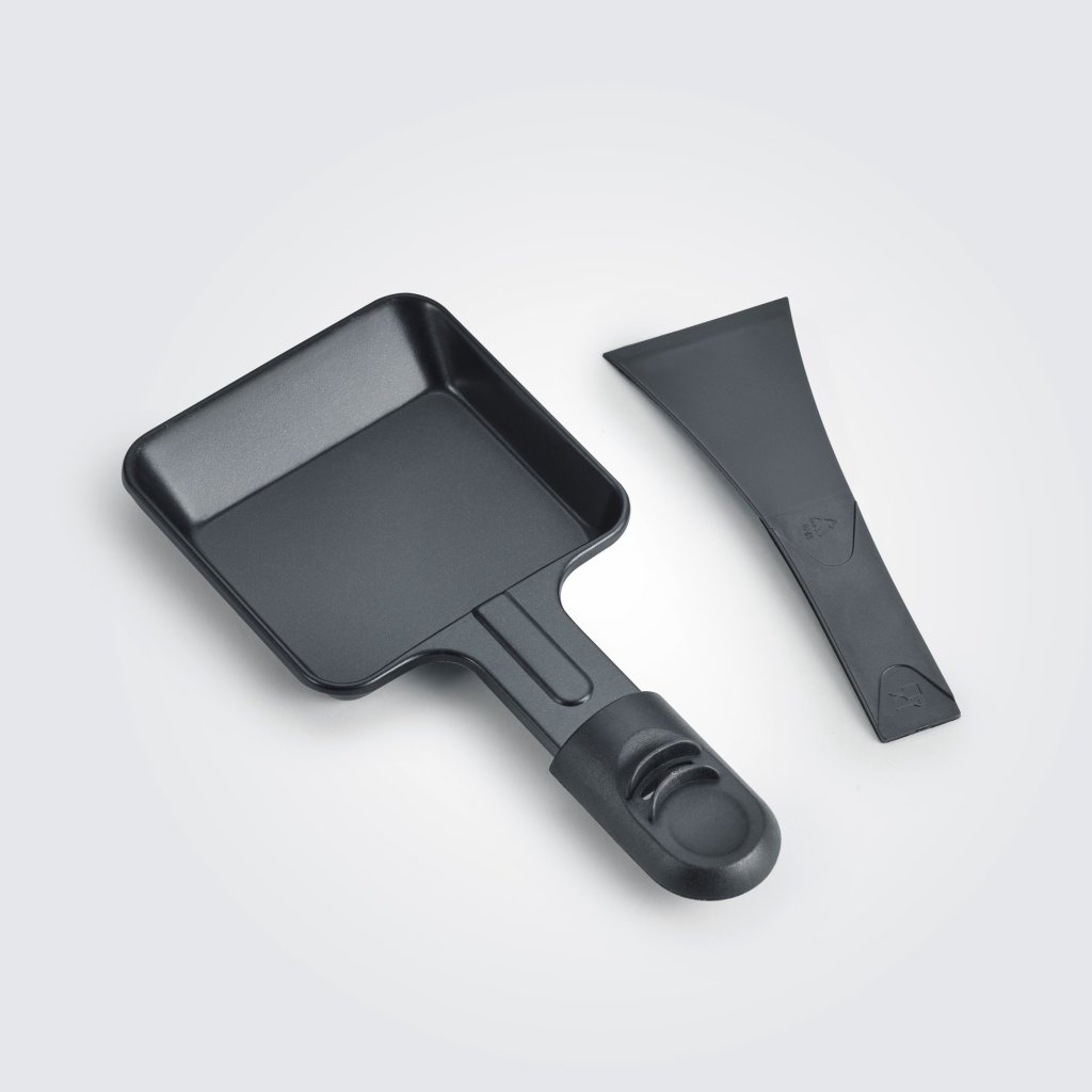 - sisältää 8 raclettepannua ja 8 muovilastaa, jotka ovat ihanteellisia yksittäisten annosten valmistukseen pöydässä