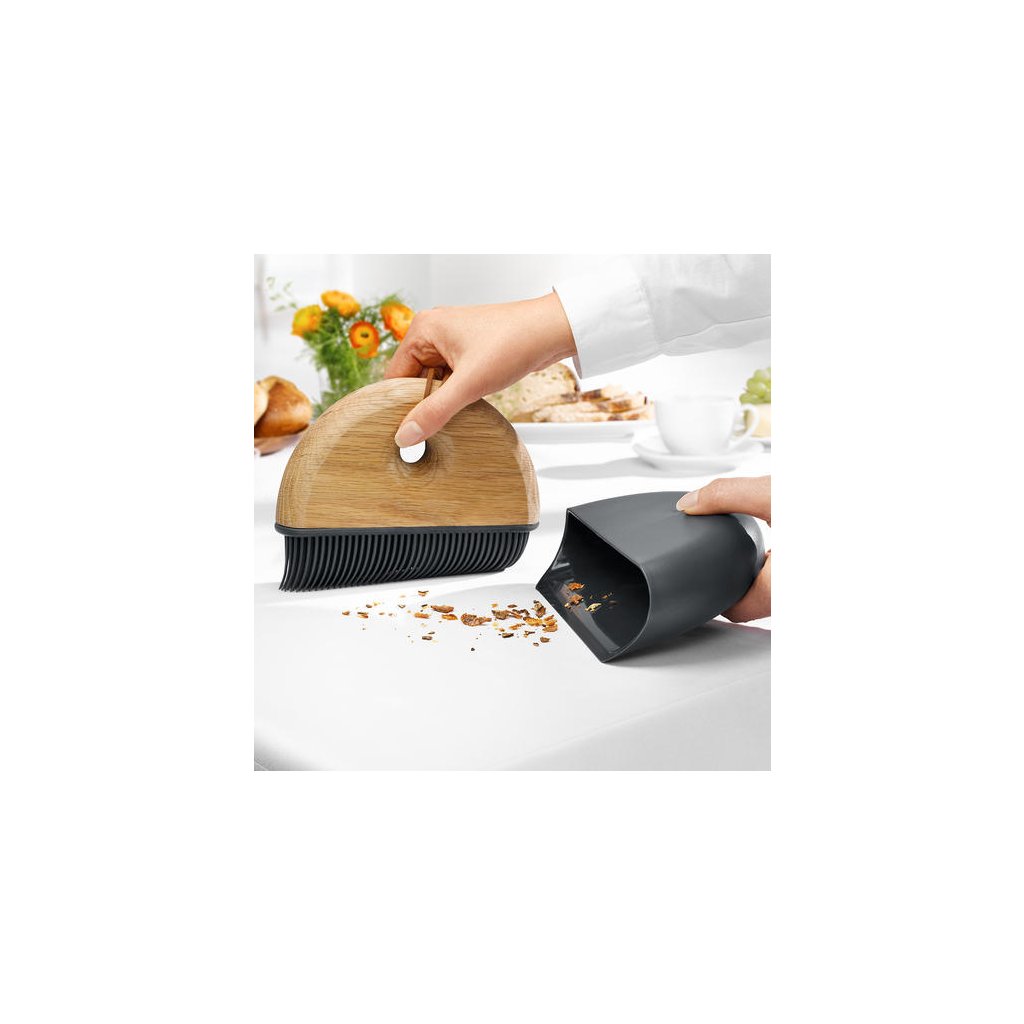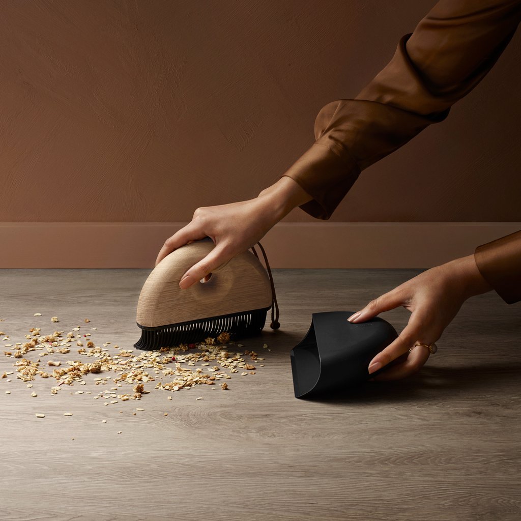 Keittiön päivittäisessä käytössä sattuu, että jotain kaatuu, murenee. Kokonsa ja käytännöllisen pakkauksensa ansiosta tämä Eva Solon kätevä keittiöapulainen voidaan ripustaa tai säilyttää laatikossa, ja se on aina käsillä. Harjan harjakset on valmistettu silikonista ja kahva tammipuusta. Terä on valmistettu muovista, joten se on helppo huoltaa. Kahvassa on käytännöllinen ripustusreikä, ja siinä on ylimääräinen nahkanauha, johon setti voidaan myös ripustaa.