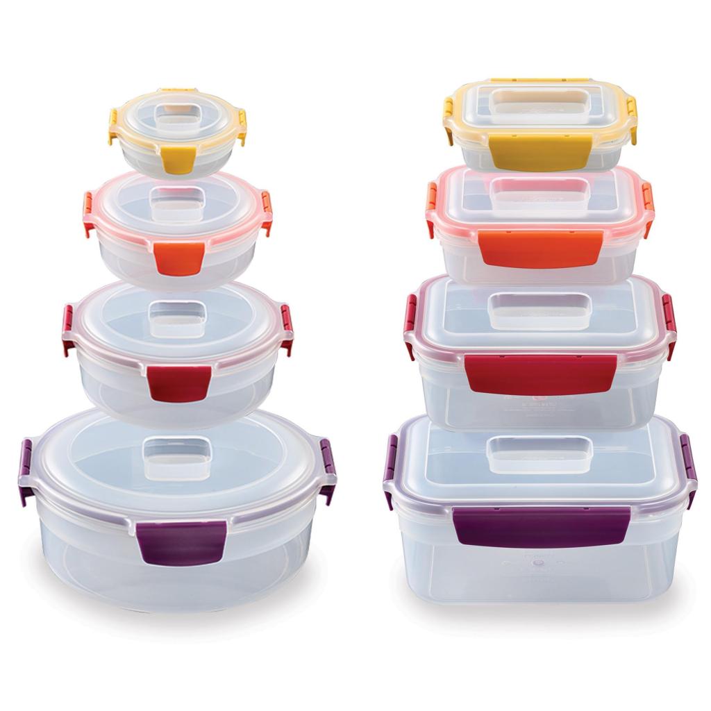 - Pyöreiden ja suorakulmaisten muotojen yhdistelmä tarjoaa maksimaalisen joustavuuden erilaisten elintarvikkeiden säilytykseen, pienistä välipaloista suurempiin perheannoksiin.
