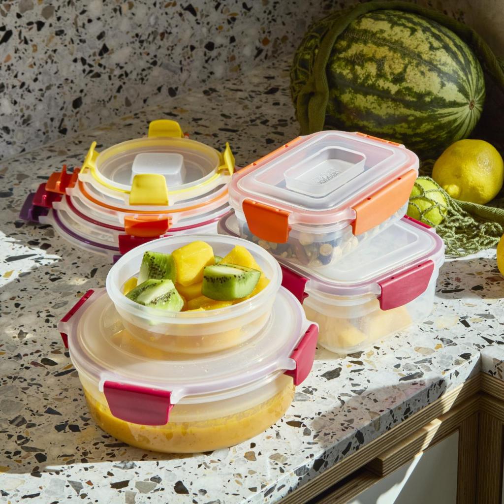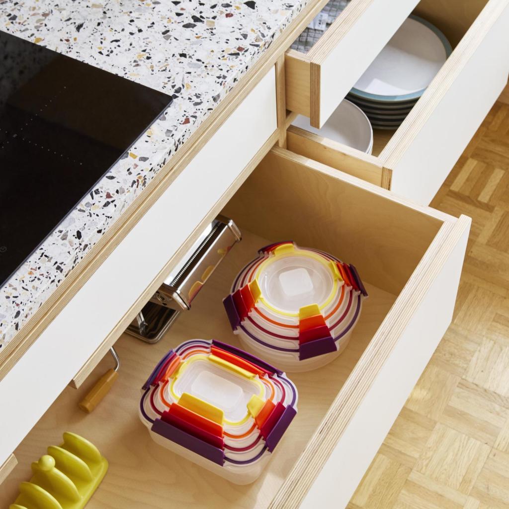- 8 Joseph Joseph NEST LOCK -monivärinen elintarvikelaatikoiden sarja tarjoaa kattavan ratkaisun keittiön järjestämiseen, tuoreiden raaka-aineiden säilyttämiseen ja valmiiden aterioiden kätevään kuljettamiseen.