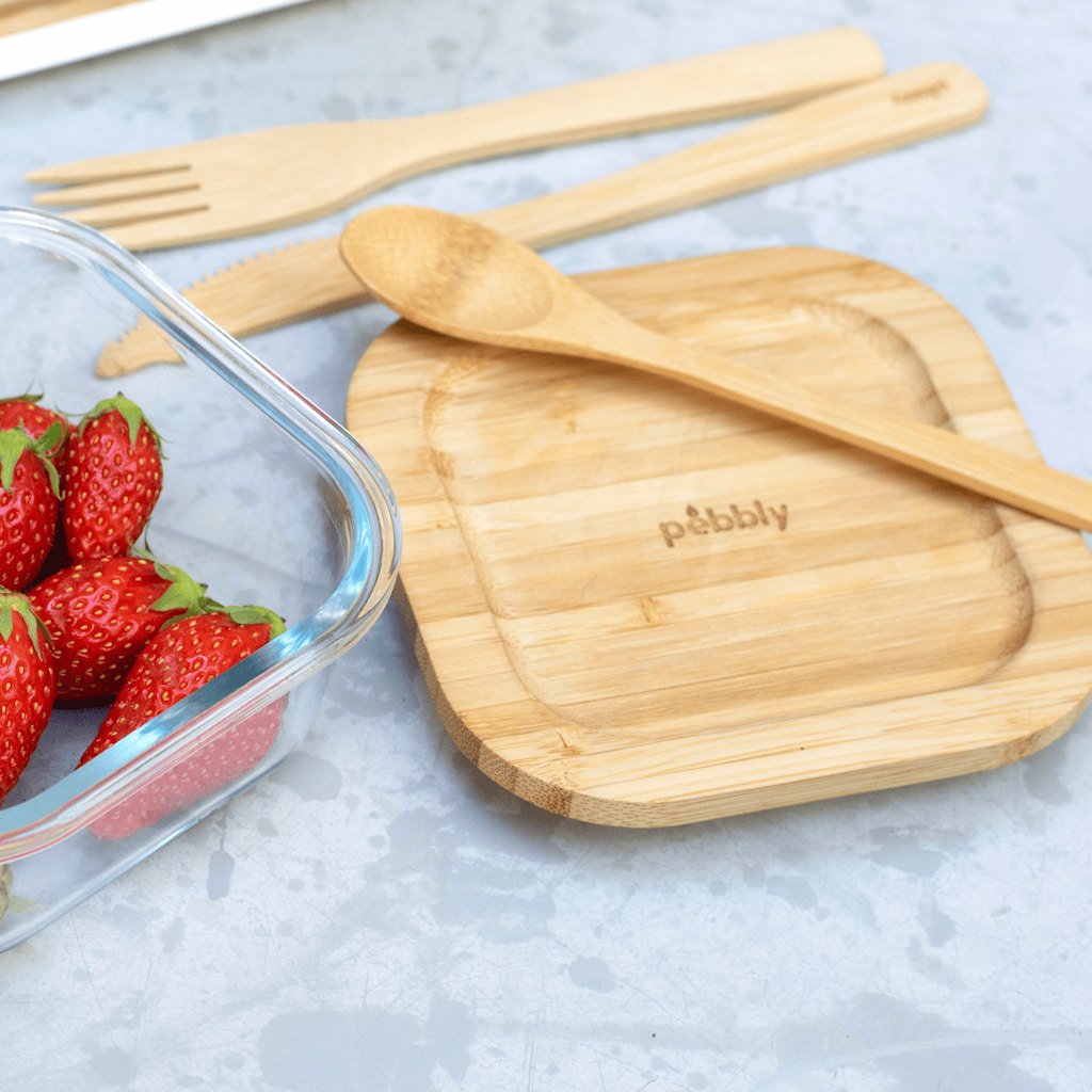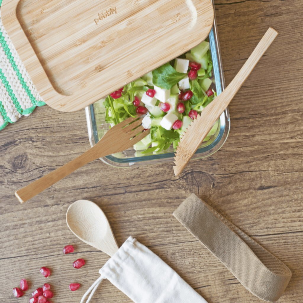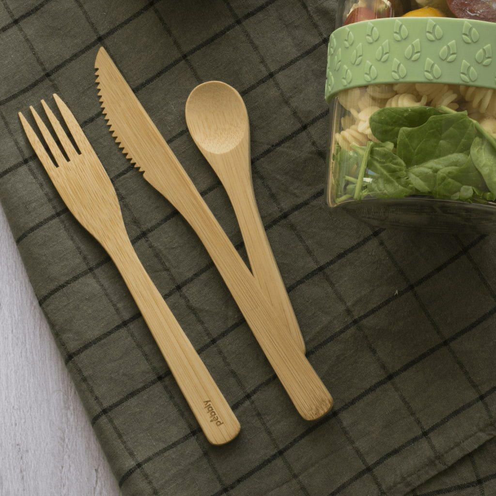 - Kolmiosainen bambusta valmistettu aterinsetti Pebbly on ihanteellinen valinta kaikille, jotka etsivät kestävää vaihtoehtoa kertakäyttömuoville.