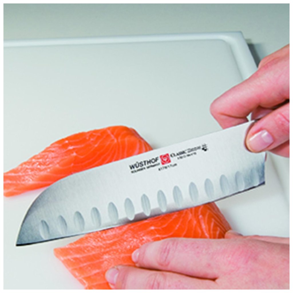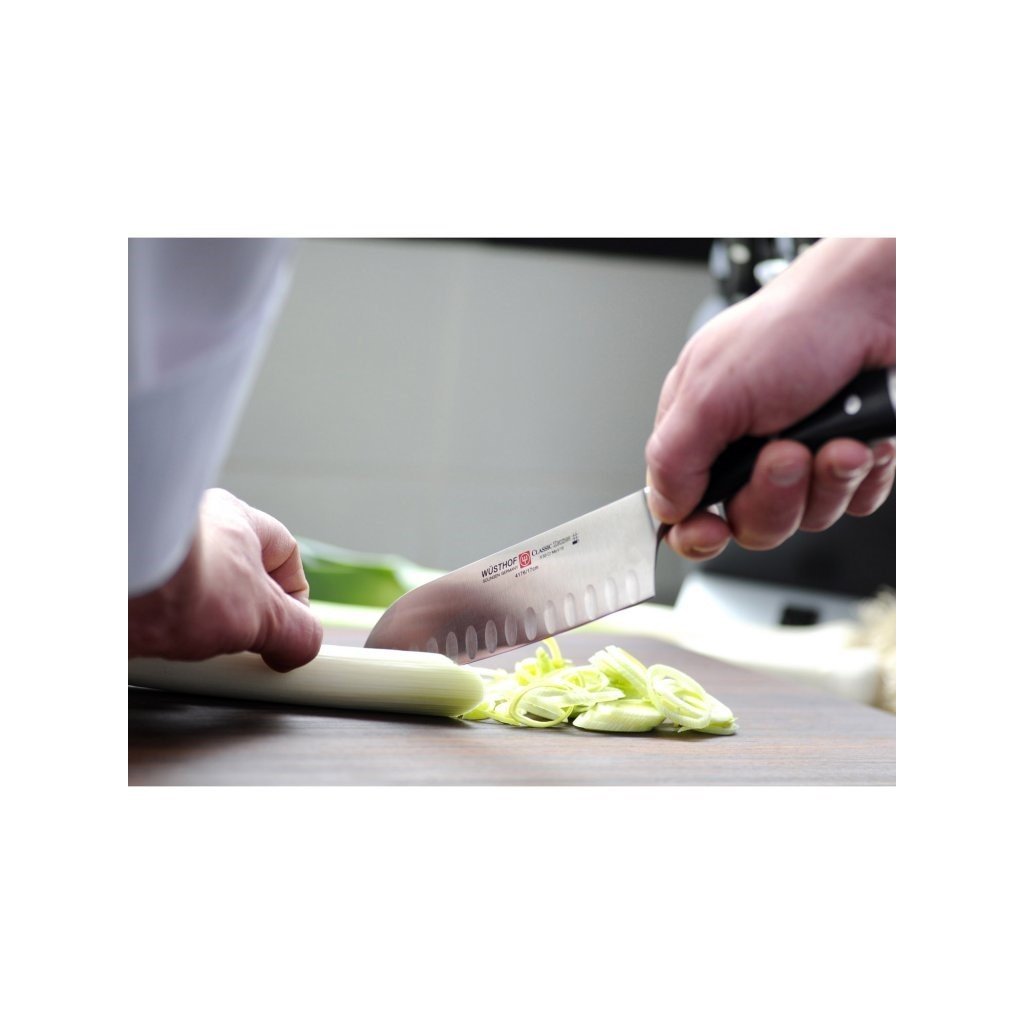 Classic Ikon Santoku -veitsi kuuluu aasialaisiin veitsiin. Siinä on leveä ja ennen kaikkea terävä terä. Tätä aasialaisen keittiön monitoimimiestä voidaan käyttää kolmella tavalla: lihan, kalan ja vihannesten valmistukseen.