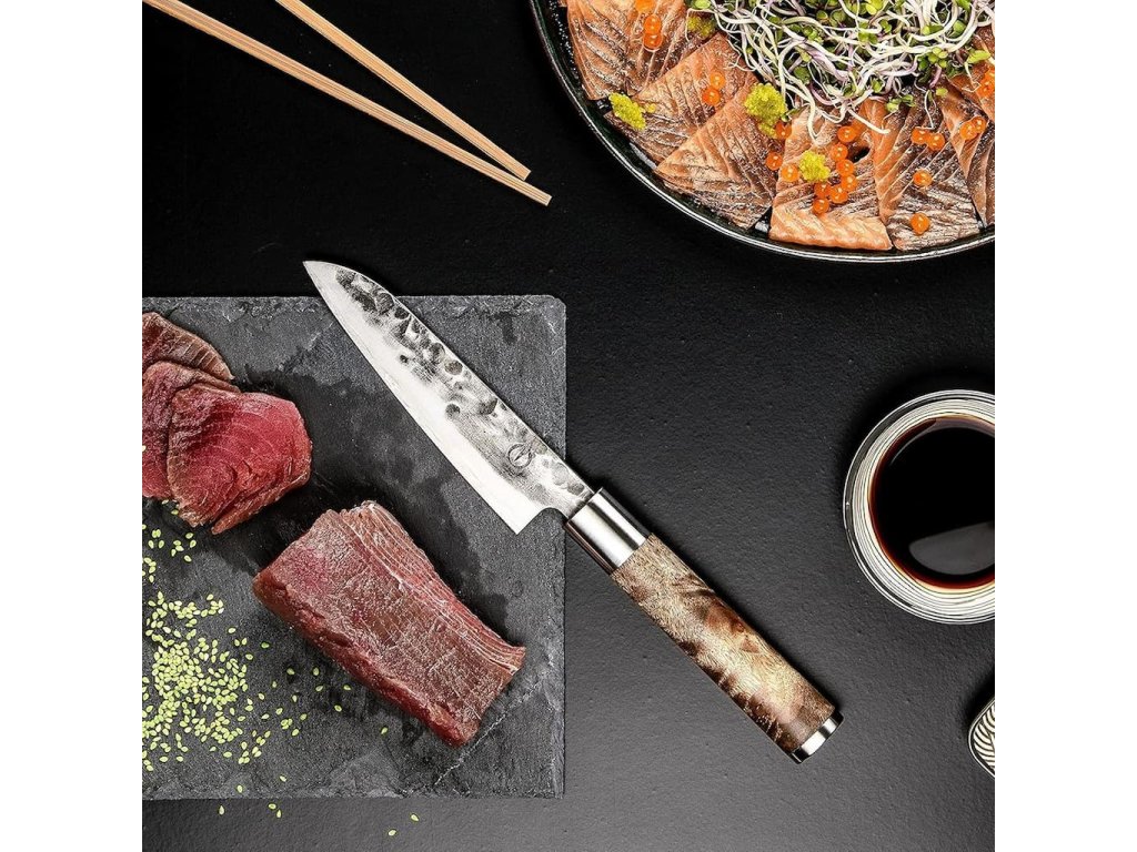 - japanilainen veitsi Santoku Forged VG10 14 cm terällä on korvaamaton apulainen jokapäiväisiin keittiötehtäviin, hienosta viipaloinnista yrttien pilkkomiseen.