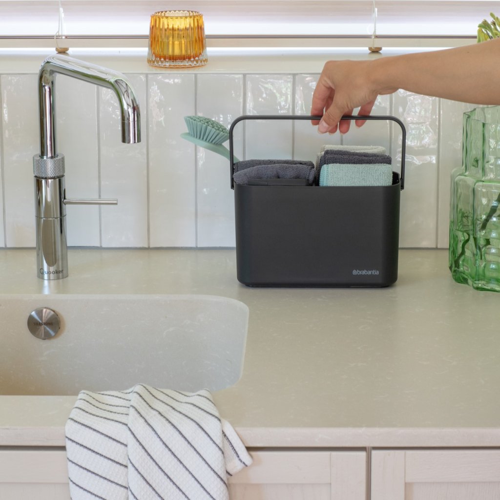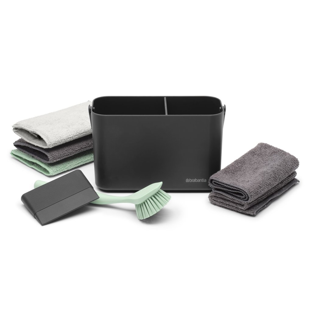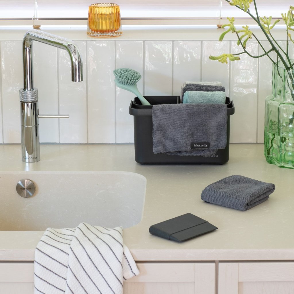 - Tummanharmaa Brabantia SINKSIDE-siivoustyökalusetti sisältää kaiken tarvittavan keittiösi säännölliseen puhtaanapitoon ja siistinä pitämiseen.