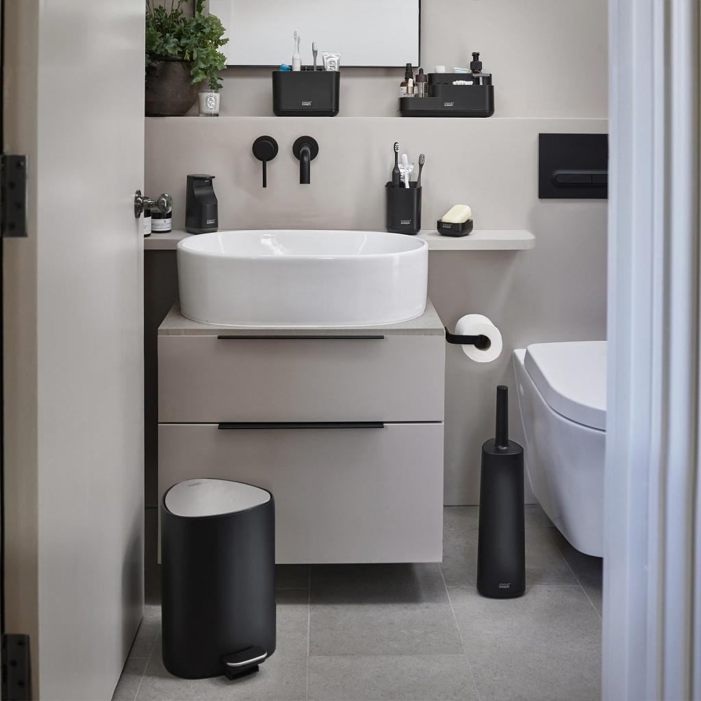 - EASYSTORE-kylpyhuonejärjestelijä mustana tuo selkeän ja tyylikkään ratkaisun jokapäiväisen hygienian kaikkien välttämättömyyksien järjestämiseen.